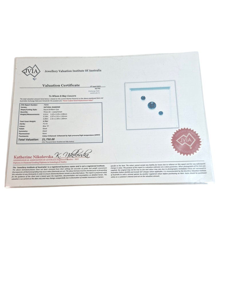 THREE ROUND BRILLIANT CUT NATURAL DIAMONDCarat: 0.51Ct , 0.10 Ct, 0.09 CtTotal Weight: 0.70 CtClarity: P1-P2 Colour: Blue 'H'Polish: Good Symmetry: Good Fluorescence: NoneTotal Item Weight: 0.13gThis valuation has been conducted by an independent third-party professional. The valuation amount is an assessment by the issuing valuer and does not reflect the auction value of the item.Any inquiries regarding the valuation should be directed to the issuing valuer (refer to contact details on the certificate), as Lloyds Auctions has no affiliation or influence over the valuation, the valuer, or the stated amount.Insurance Replacement Valuation Amount: $1,750.00584449+4