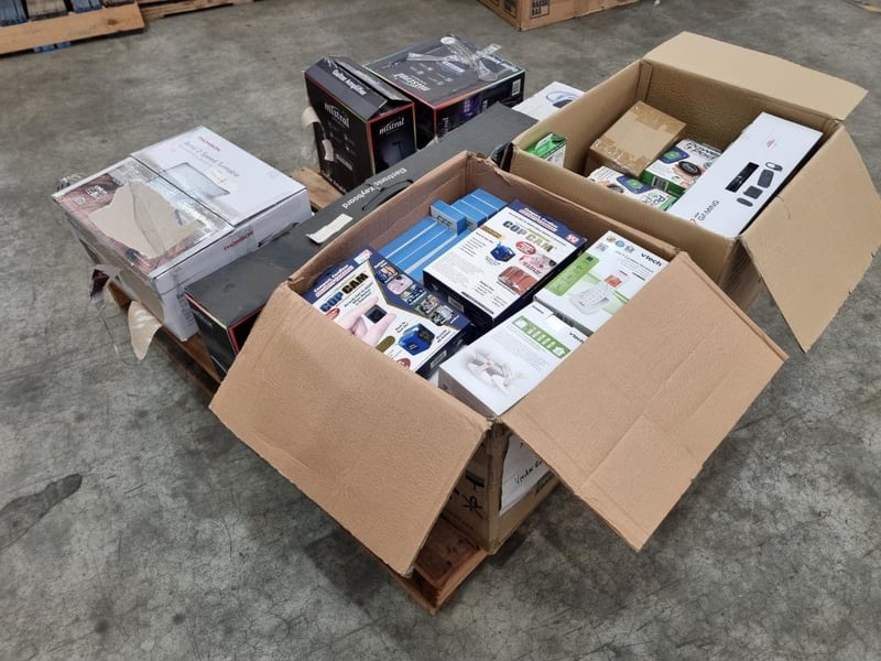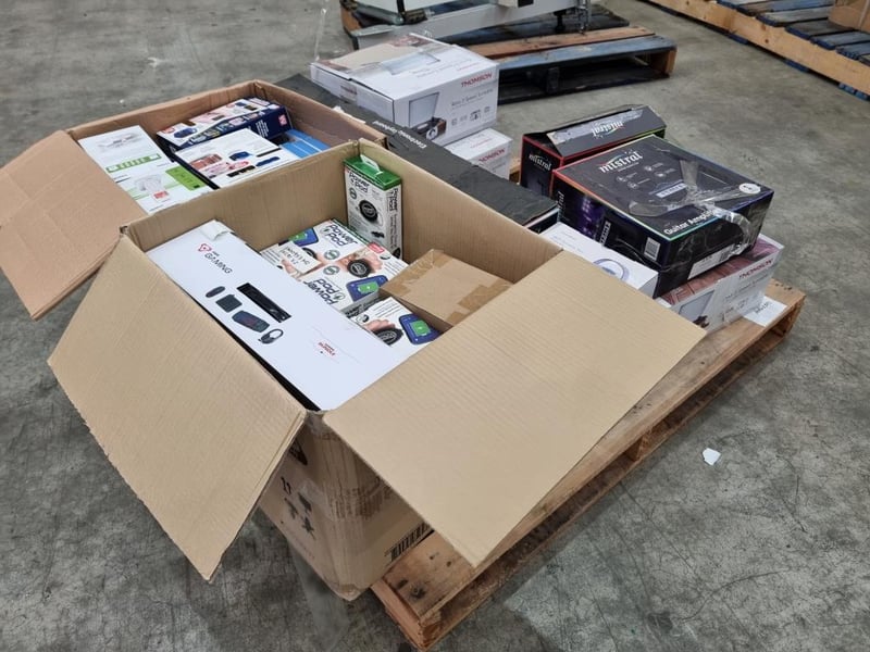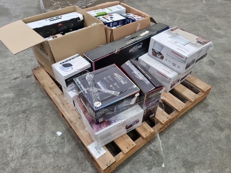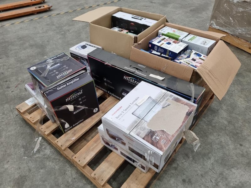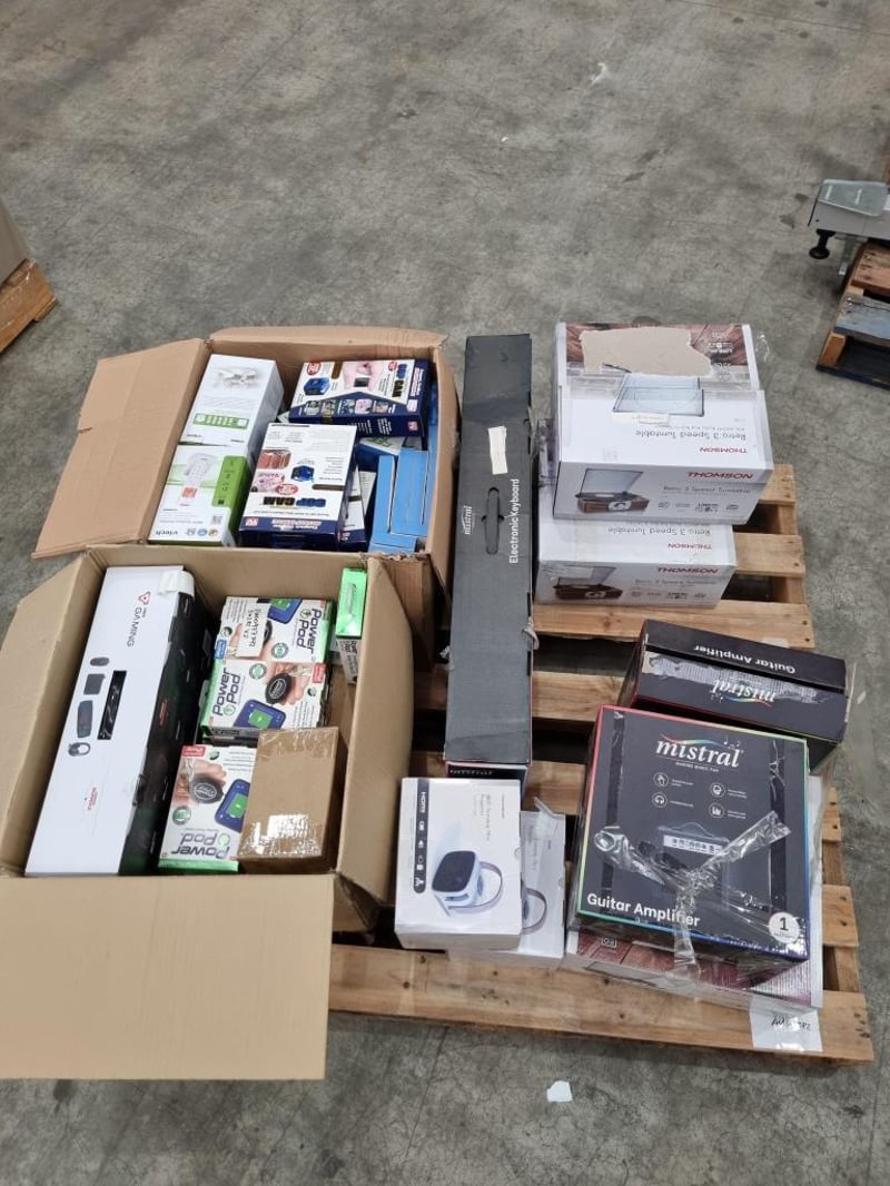 Assorted Bundle of Includes: Thomson Retro 3-Speed Turntable Thomson 480p Portable Mini Projector Mistral Electronic Keyboard Mistral Guitar Amplifier PowerPod Keychain Phone Chargers — pocket-size emergency chargers (mix of Lightning & USB-C) COP CAM Motion-Activated HD Mini Security Cameras VTech DECT Cordless Handsets Thomson Gaming Microphone TM-CGB-001 Tyro GO EFTPOS Reader |Wonderlust Sound Soother REVO Speaker Laser Gaming Bundle Every Avenue Wireless Connect Keyboard & Mouse Harry Potter Wired Headphones Every Avenue Wired Headphones w/ Boom Mic 5EF Heart Rate Monitor