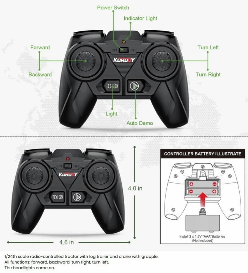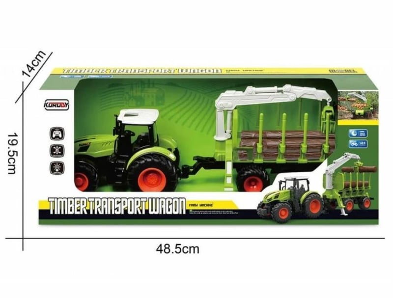 RC Tractor & Log Carrier Trailor/Crane & Logs Manual Use Crane for Loading Trailor 1/24 Scale 6 Channel Demo Mode Cabin Lights Approx 44cm Length with Trailor Easy to use Remote Super Wide Quality Rubber Tyres Up to 30 mins Use Time depend on Function use Solid Alloy & Plastic Construction (remote batteries not included) BRAND NEW IN BOX