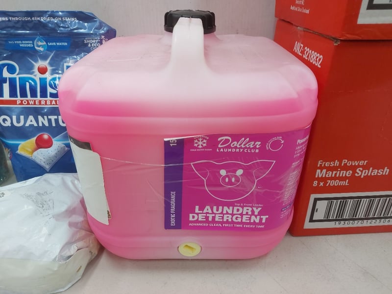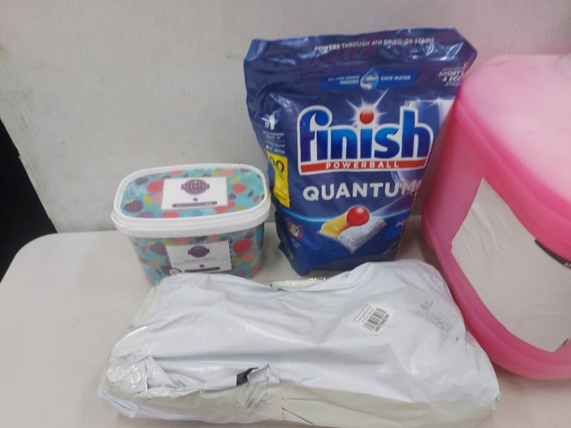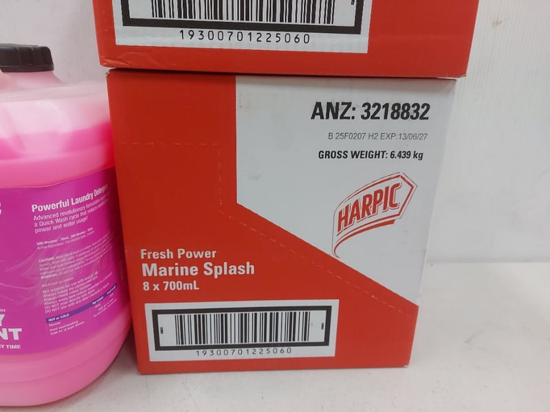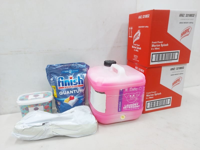 Washing/Cleaning Products, Including Harpic Cleaner, Dishwashing Tablets, Wasserman Whiffs, Laundry Detergent & Toilet BrushSold As Lot