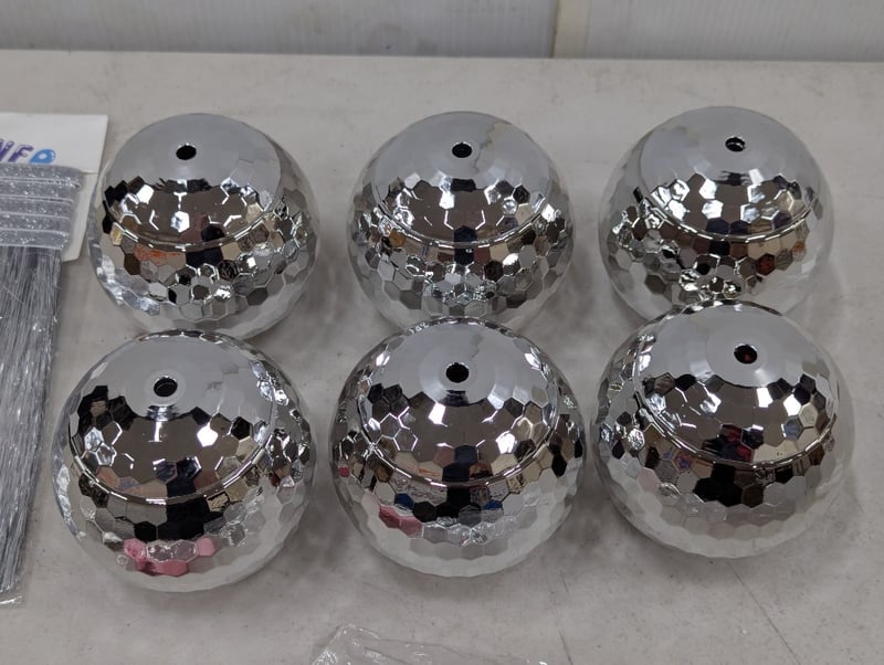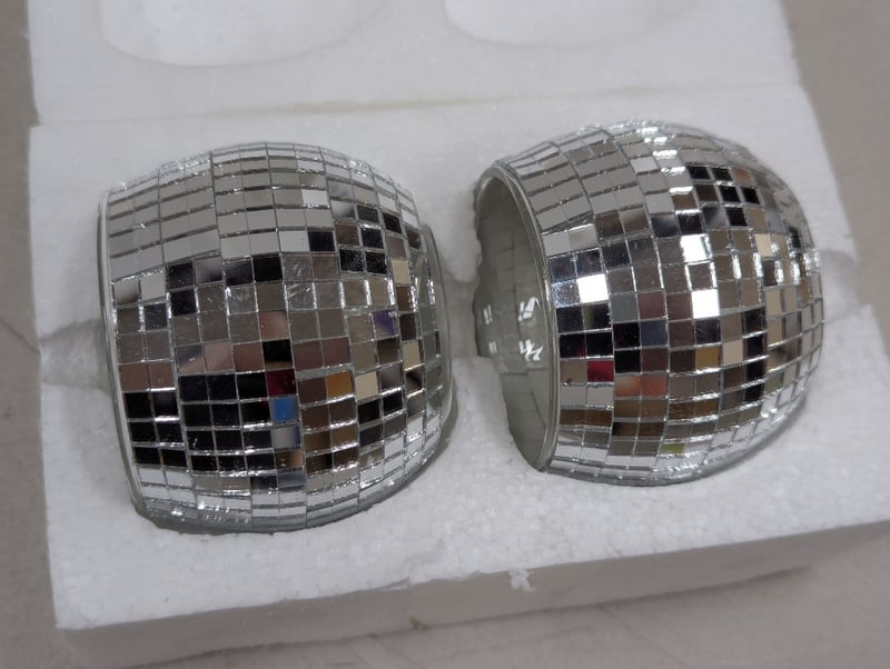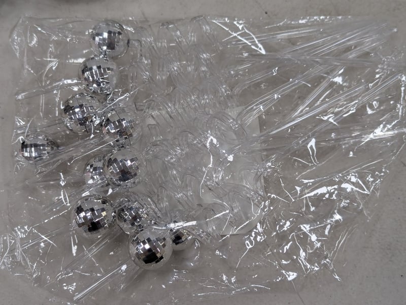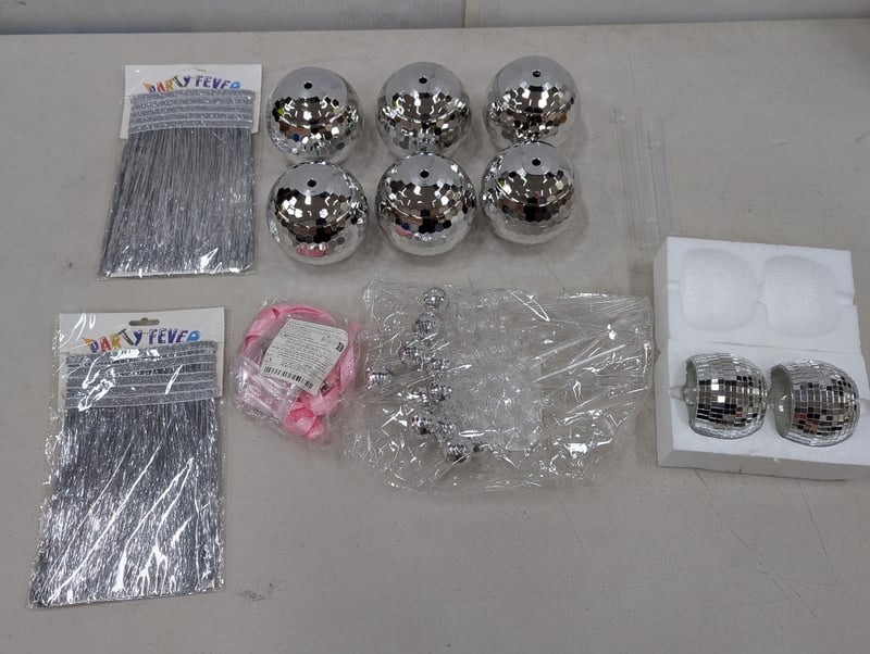 Collection of disco and party themed items, includes round cups with straws, string ribbons, straws, lanyards