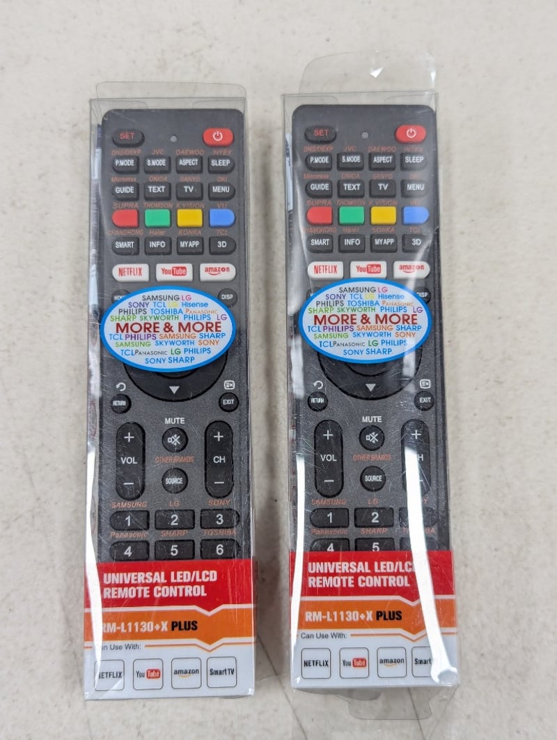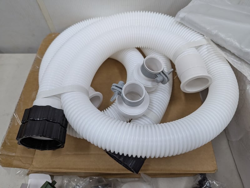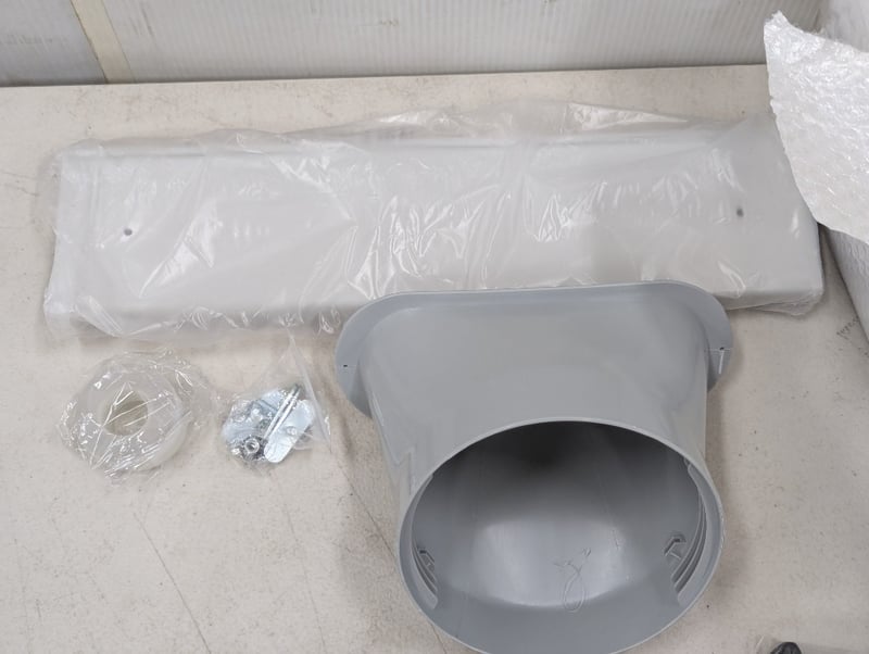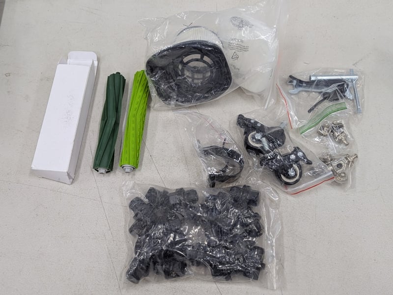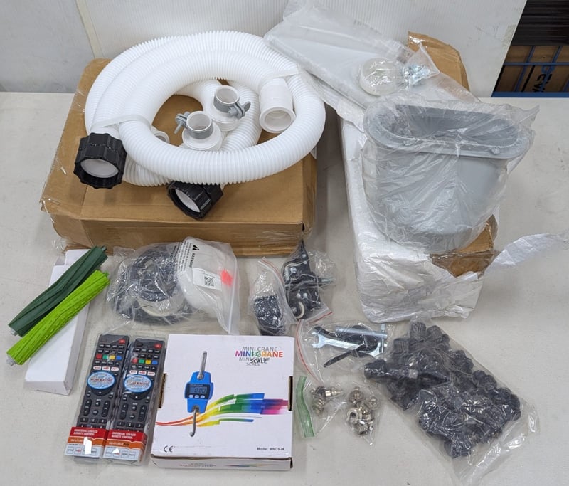 Collection of appliance parts including plastic tube with connectors, air conditioner output connector, caster wheels, two plastic rollers, two universal samsung remotes, mini crane scale