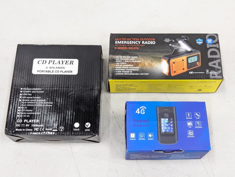 Three electronics including yeemi k21+, multifunction outdoor emergency radio, portable cd player
