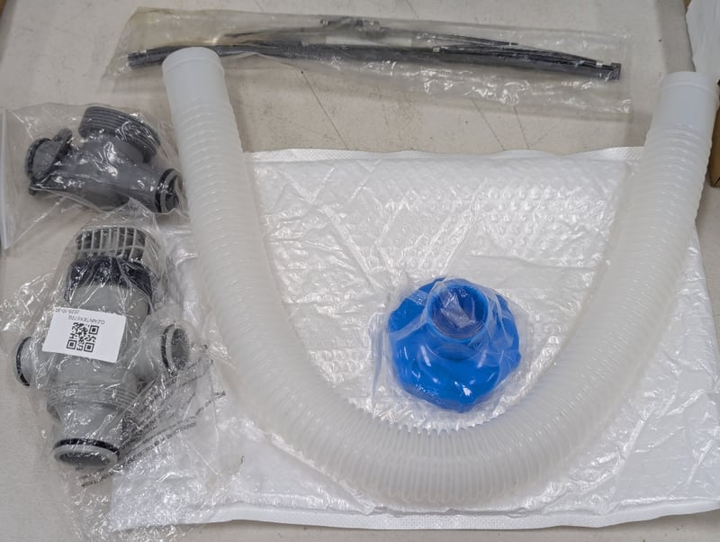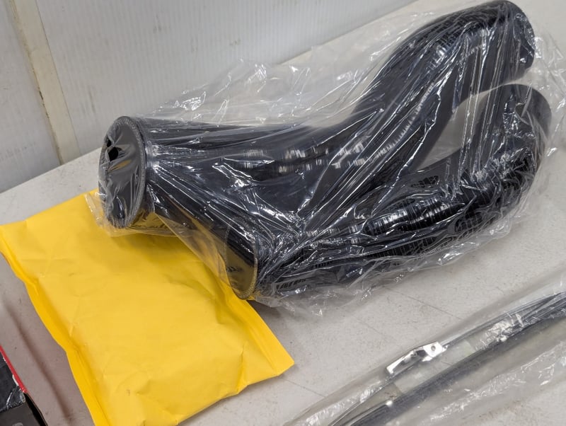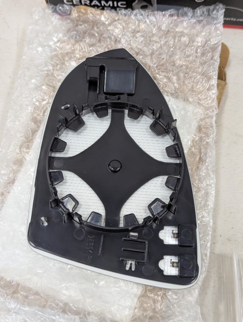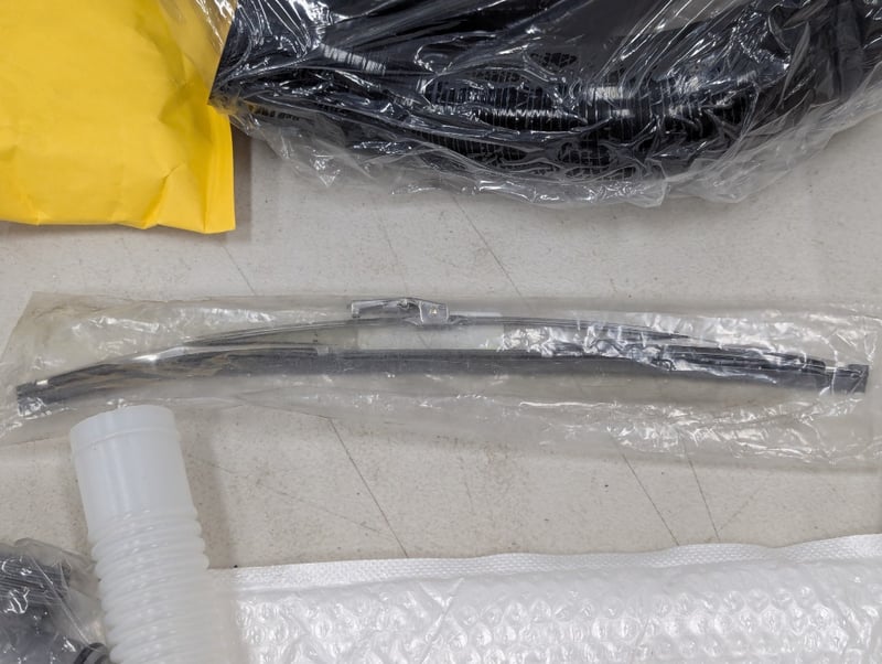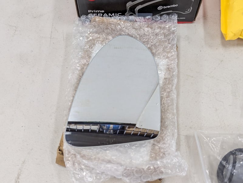 Collection of car part pieces, assorted connectors and parts, nuts and bolts, car parts include windshield wiper, side mirror, ceramic brake pad, etc