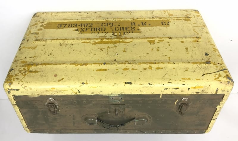 It Features A Metal Construction With A Hinged Lid, Leather Handle, And Latch Fasteners. "3793-182 Cpl.. R.W. Ga Xford Cres."