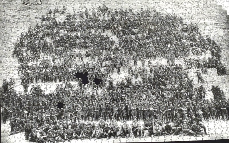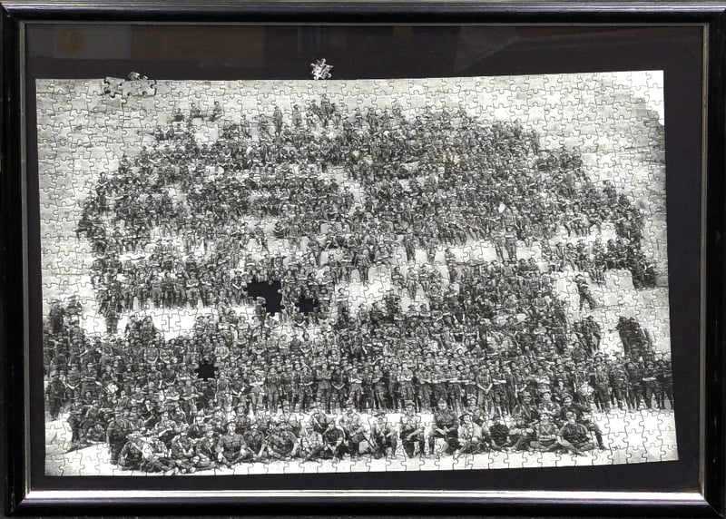 RAMED JIGSAW PUZZLE OF THE ICONIC PHOTOGRAPH DEPICTING OVER 600 SOLDIERS FROM THE AUSTRALIAN 11TH BATTALION POSING ON THE GREAT PYRAMID OF GIZA IN EGYPT.