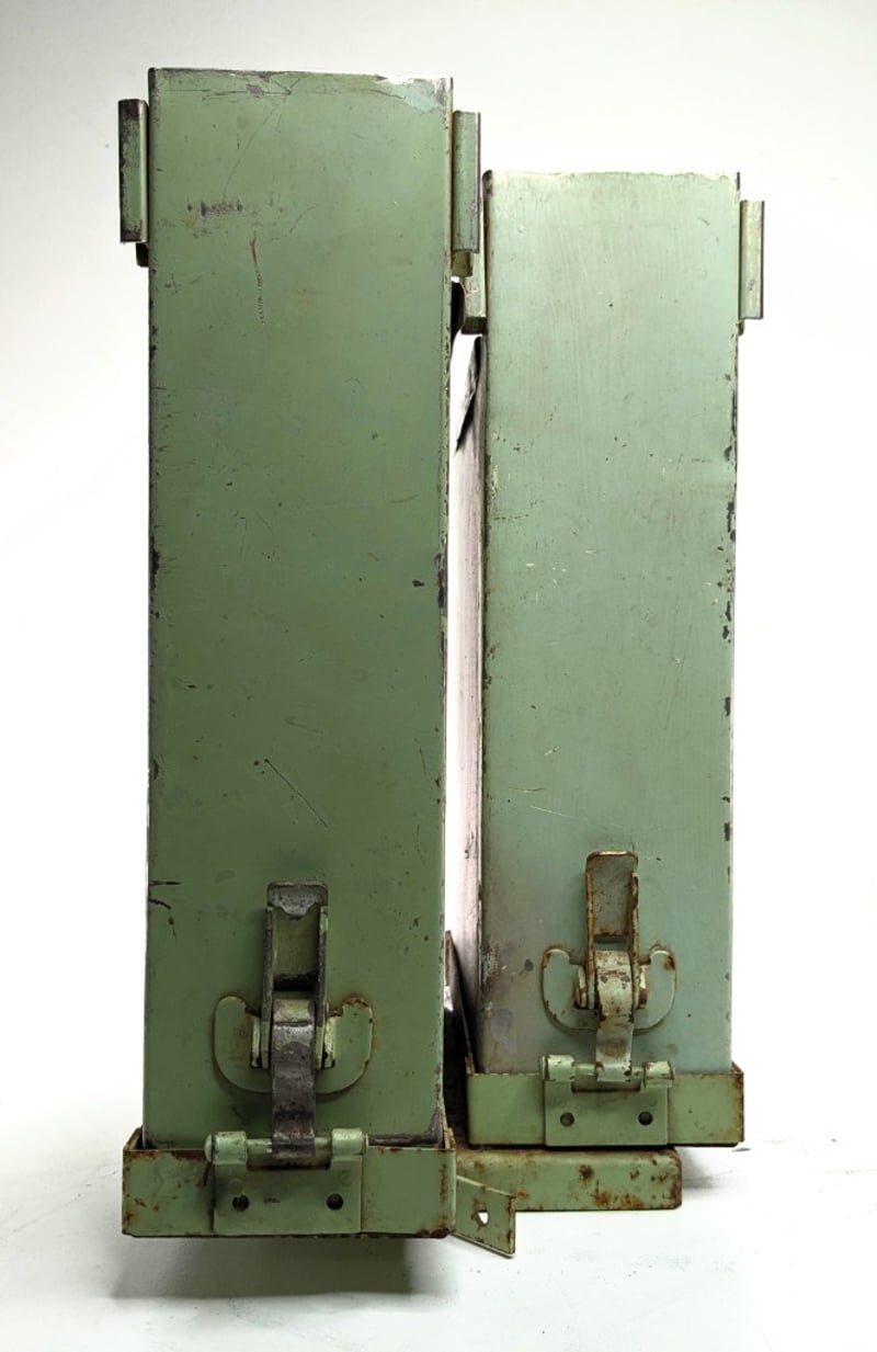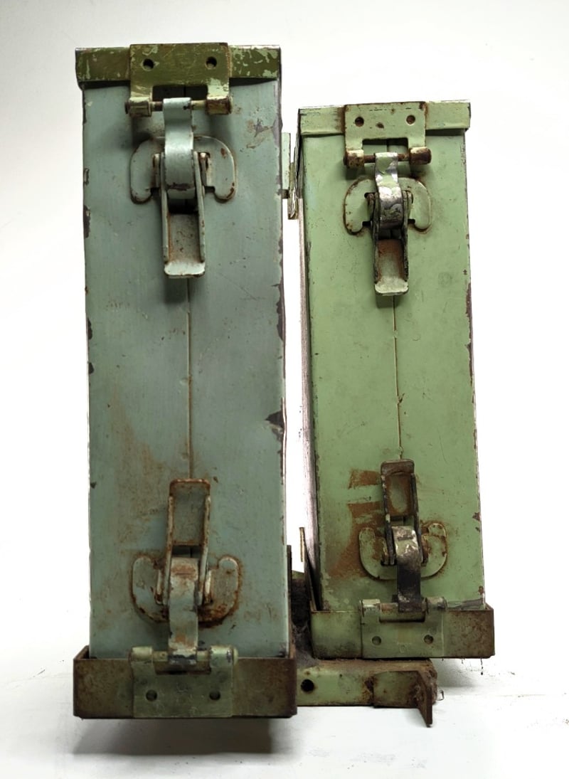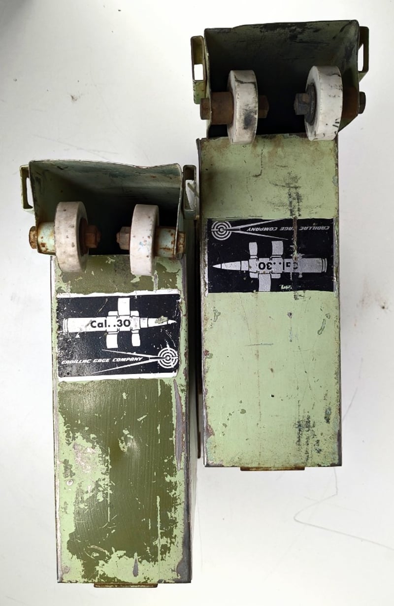 .30 CALIBER AMMUNITION BOXES MANUFACTURED BY THE CADILLAC GAGE COMPANY.Item Size: Height: 33cm, Width: 25cm, Depth: 20cm, Weight: 1KgThe Boxes Are Marked With ".30" Caliber Labels And The Manufacturer'S Name. Each Container Includes Metal Rollers On Top For Mounting Or Dispensing Ammunition Belts.Condition: Good - Refer To ImagesF3991145+6