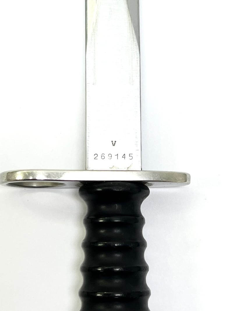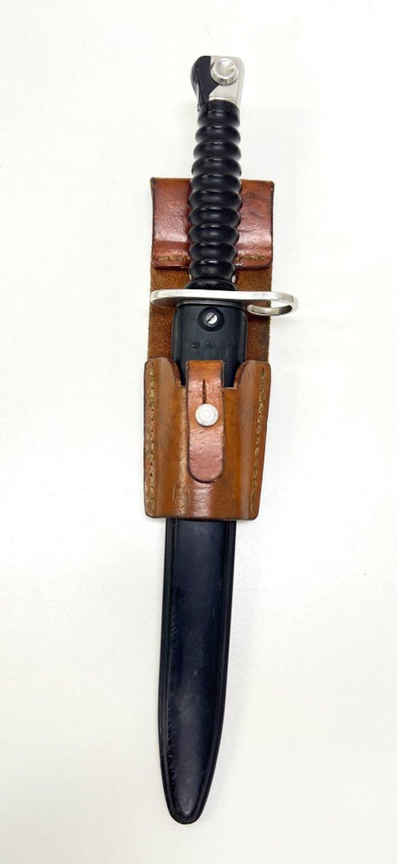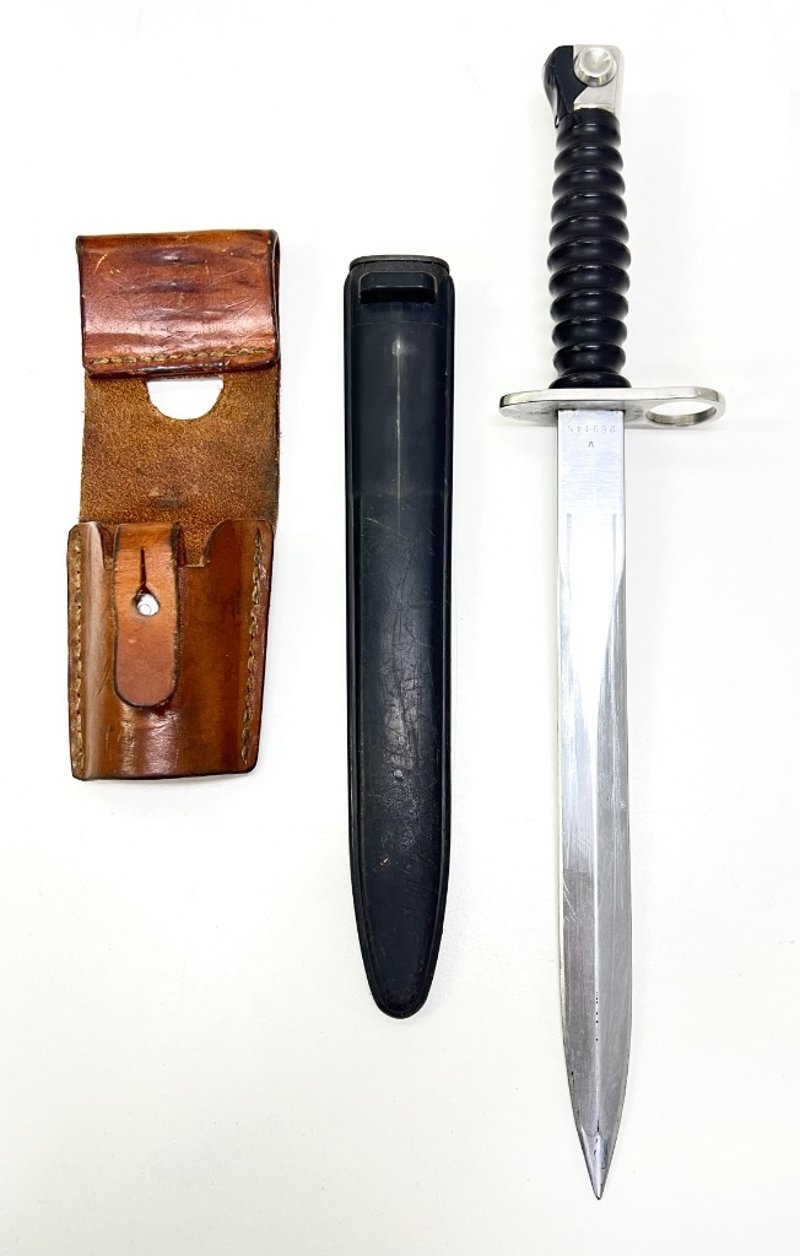 SWISS M1957 BAYONET.Item Size: Height: 5cm, Width: 8cm, Depth: 37cm, Weight: 1KgProduced From 1957 Through The Late 1980S, Sn 269145, Includes Swiss Military Leather SheathCondition: Good - Refer To ImagesFC991145+34