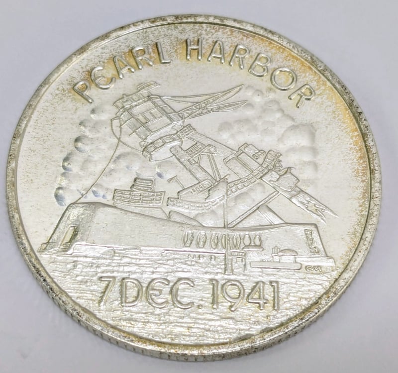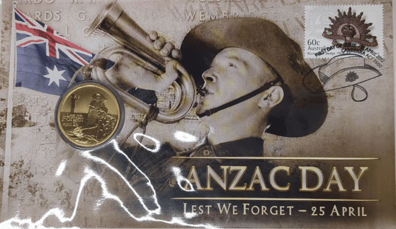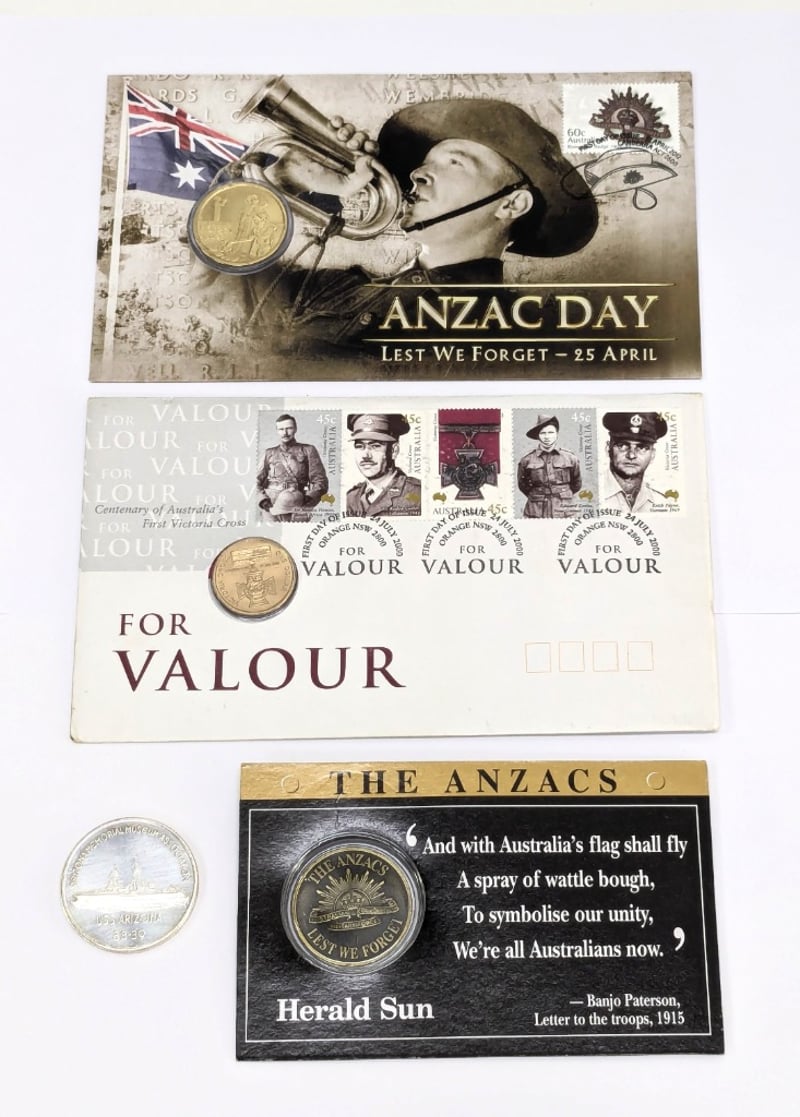 Commemorative Anzac Medal Issued By The Herald Sun Newspaper, 2000 Australian $1 For Valour Centenary Of Australia'S First Victoria Cross Pnc, 2012 Anzac Day "Lest We Forget" Stamp And Coin Cover Pnc, Uss Arizona Bb-39 Pearl Harbor Memorial Medallion Issued By The Arizona Memorial Museum Association.