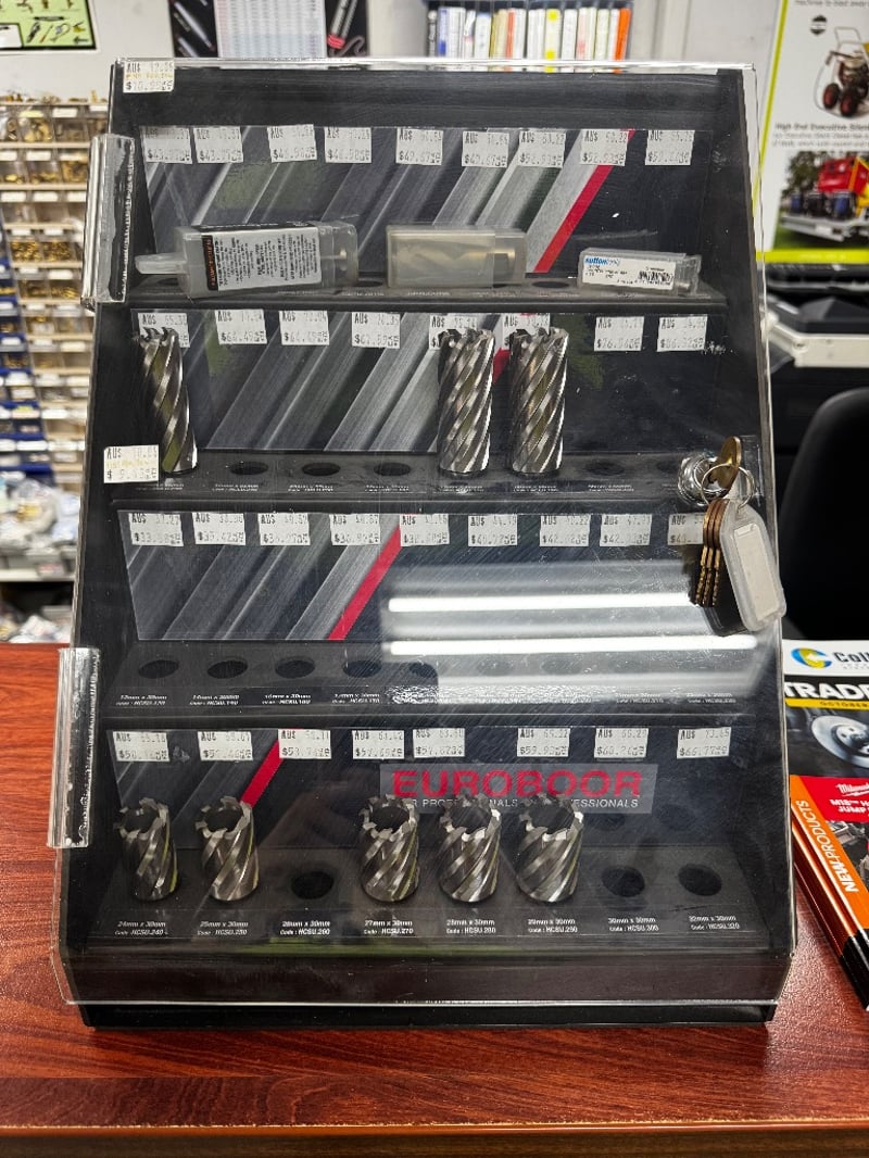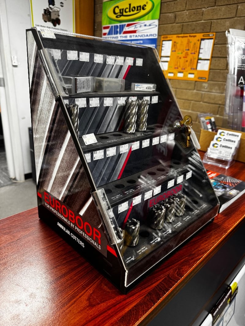 Display cabinet with Euroboor Annular cutter display cabinet, Various Sizes including 25mm, 28mm and more