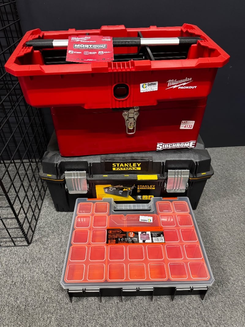 Equipment, assorted workshop equipment including Milwaukee packout, 405mm organiser with deep tubs and moresold as lot, inspection recommended
