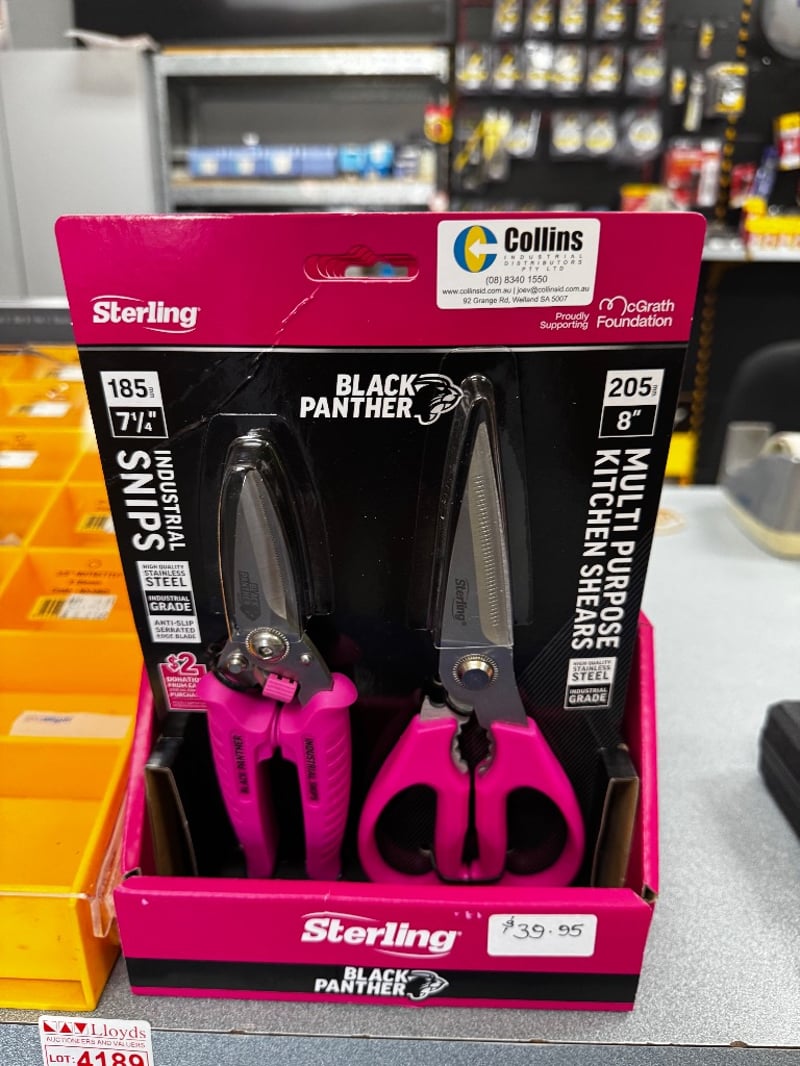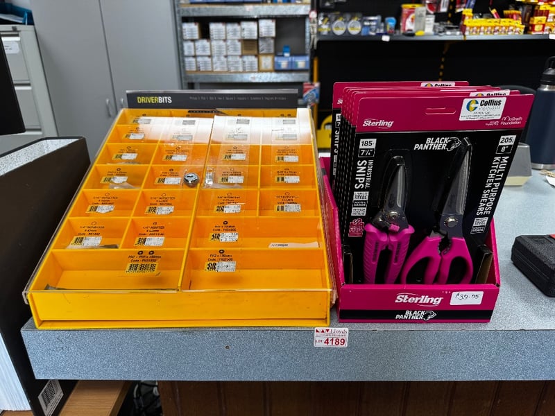 Assorted equipment includes Sterling Black Panther Hot Pink Kitchen Shears Multi Packs, Assorted Driver Bits