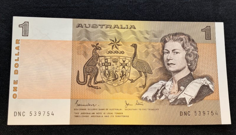 1982 JOHNSTON/STONE SIGNED AUSTRALIAN ONE DOLLAR BANK NOTE WITH ERRORError Includes Significant Serial Number Printing Degradation.Condition: Unc584436+11