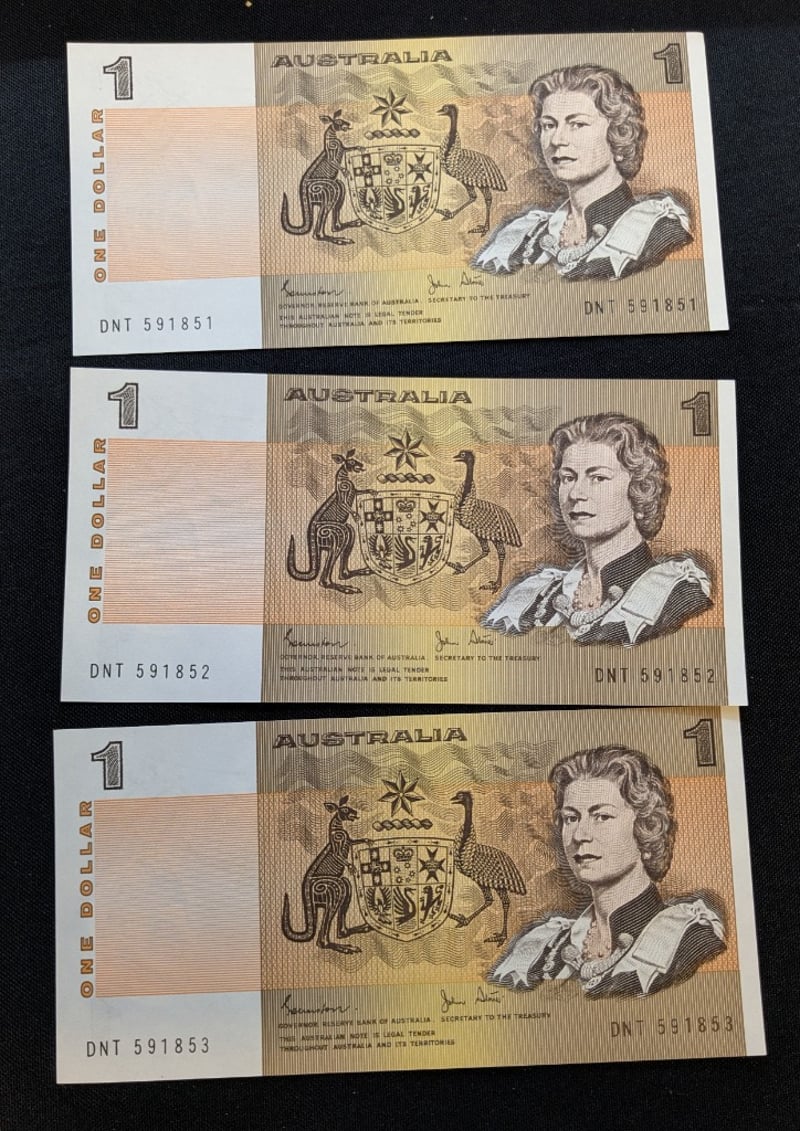 3 CONSECUTIVE UNC 1982 JOHNSTON/STONE SIGNED ONE DOLLAR NOTESCondition: Unc584436+12