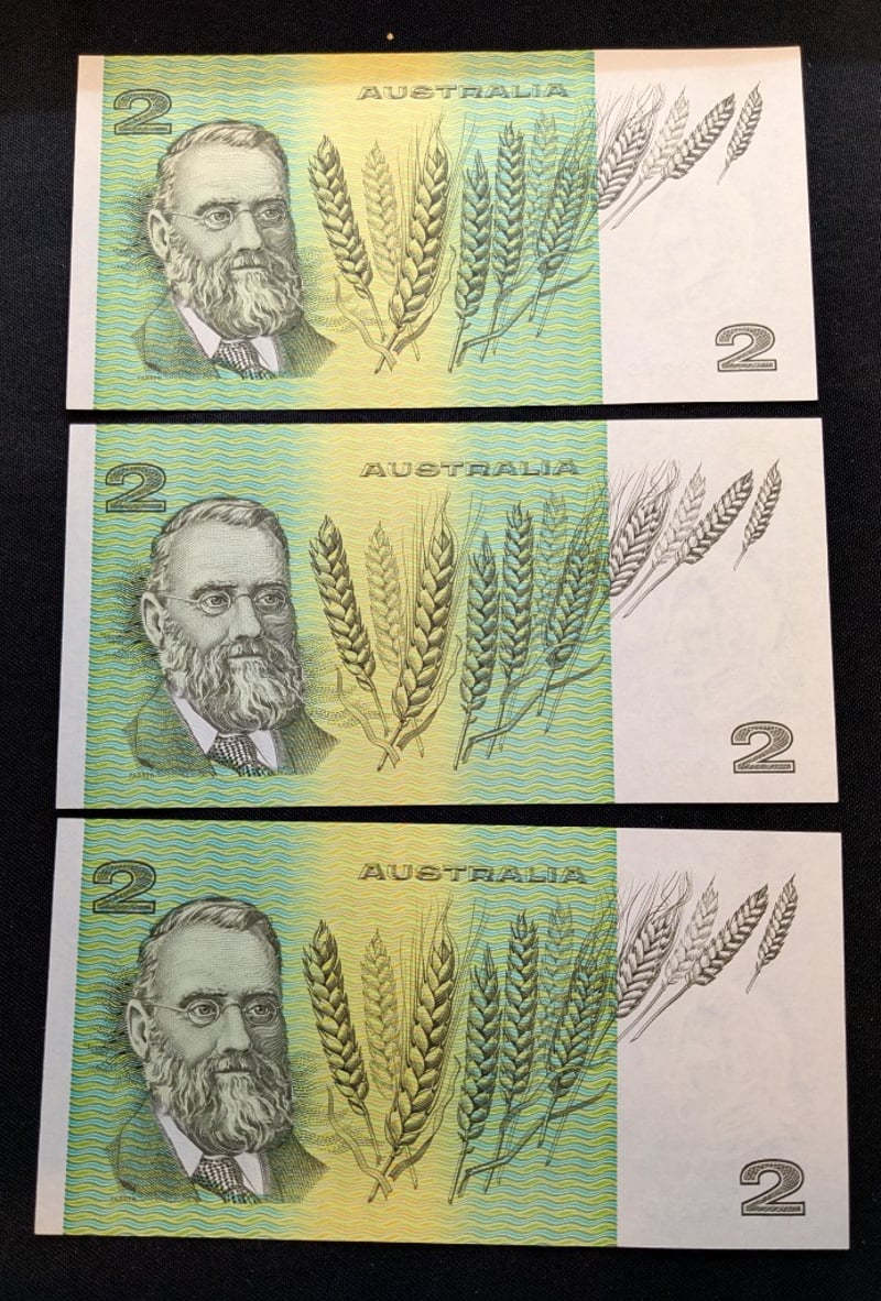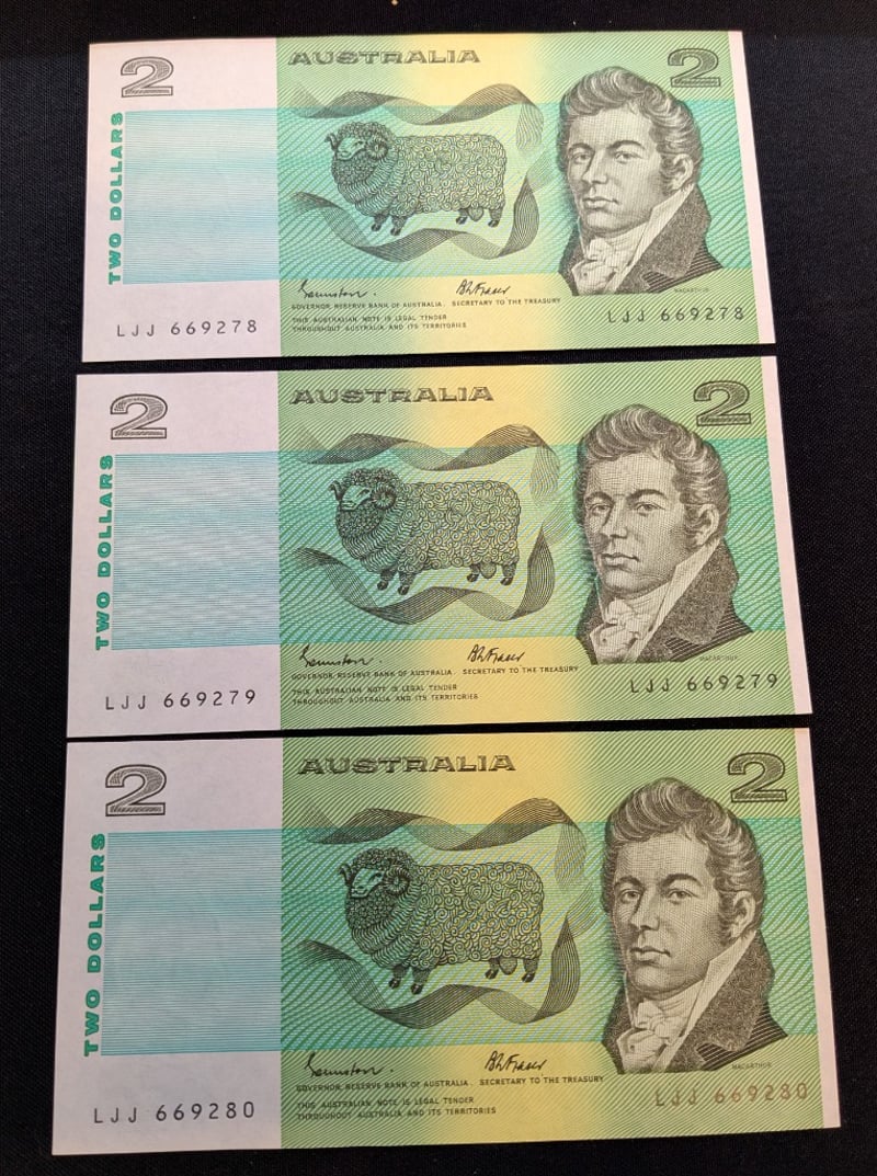 3 CONSECUTIVE UNC 1983 JOHNSTON/FRASER SIGNED TWO DOLLAR NOTESCondition: Unc584436+13