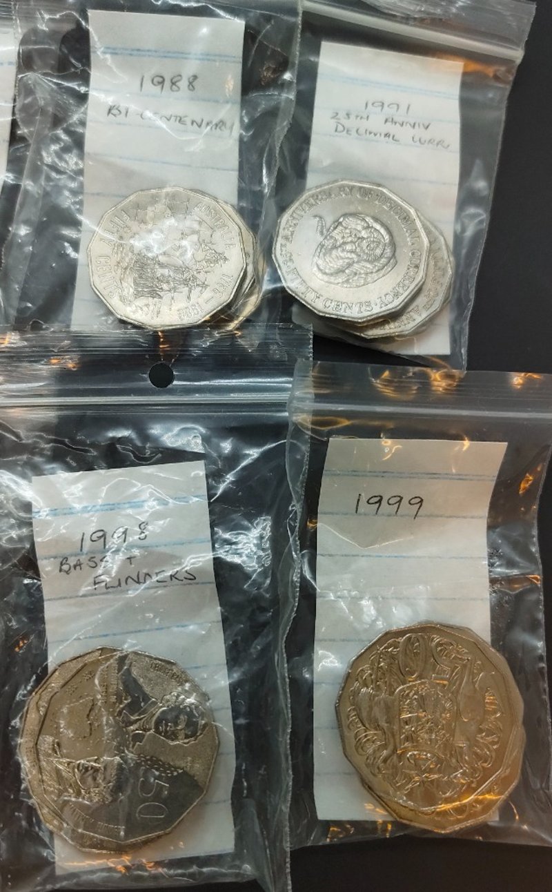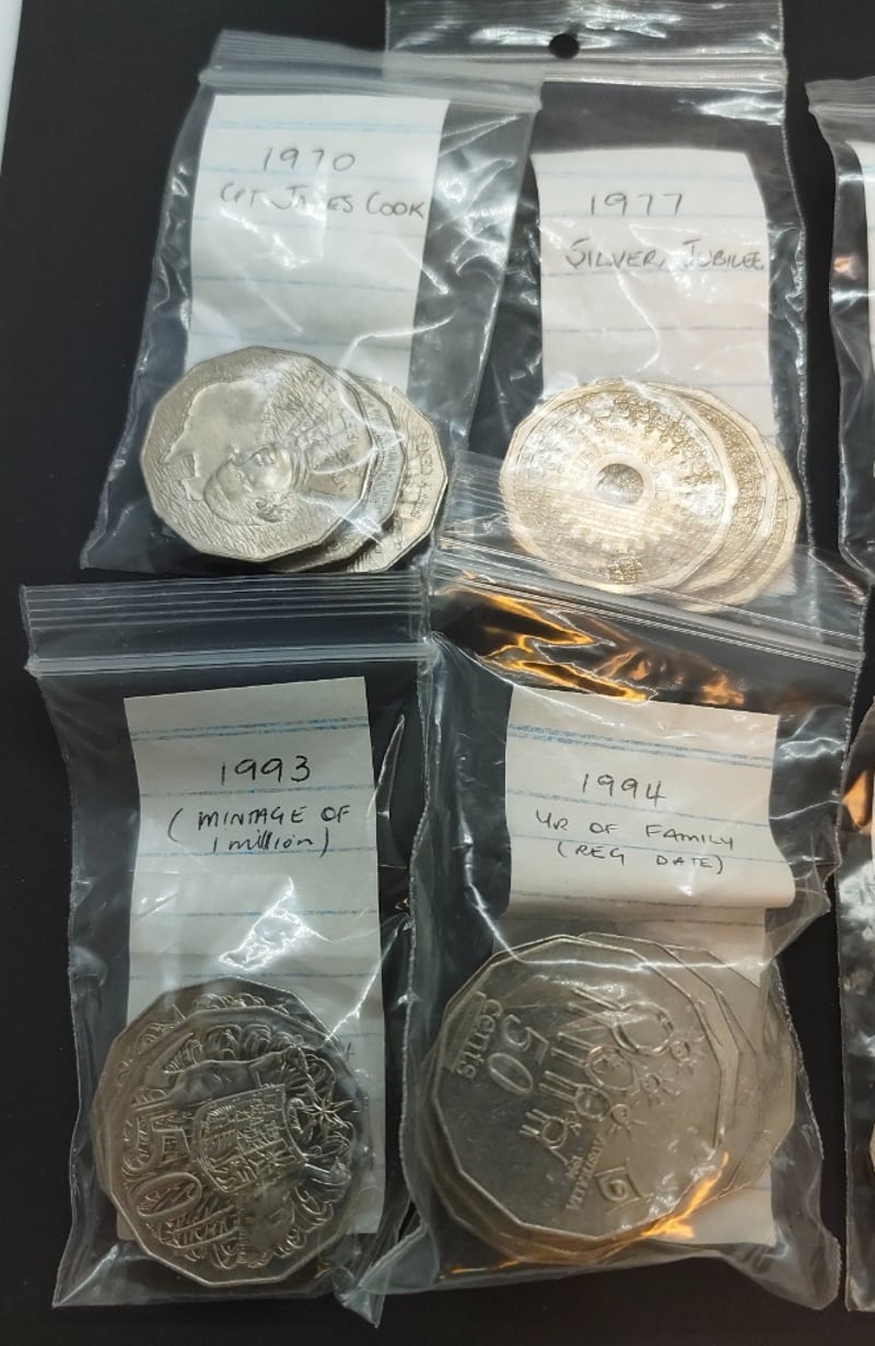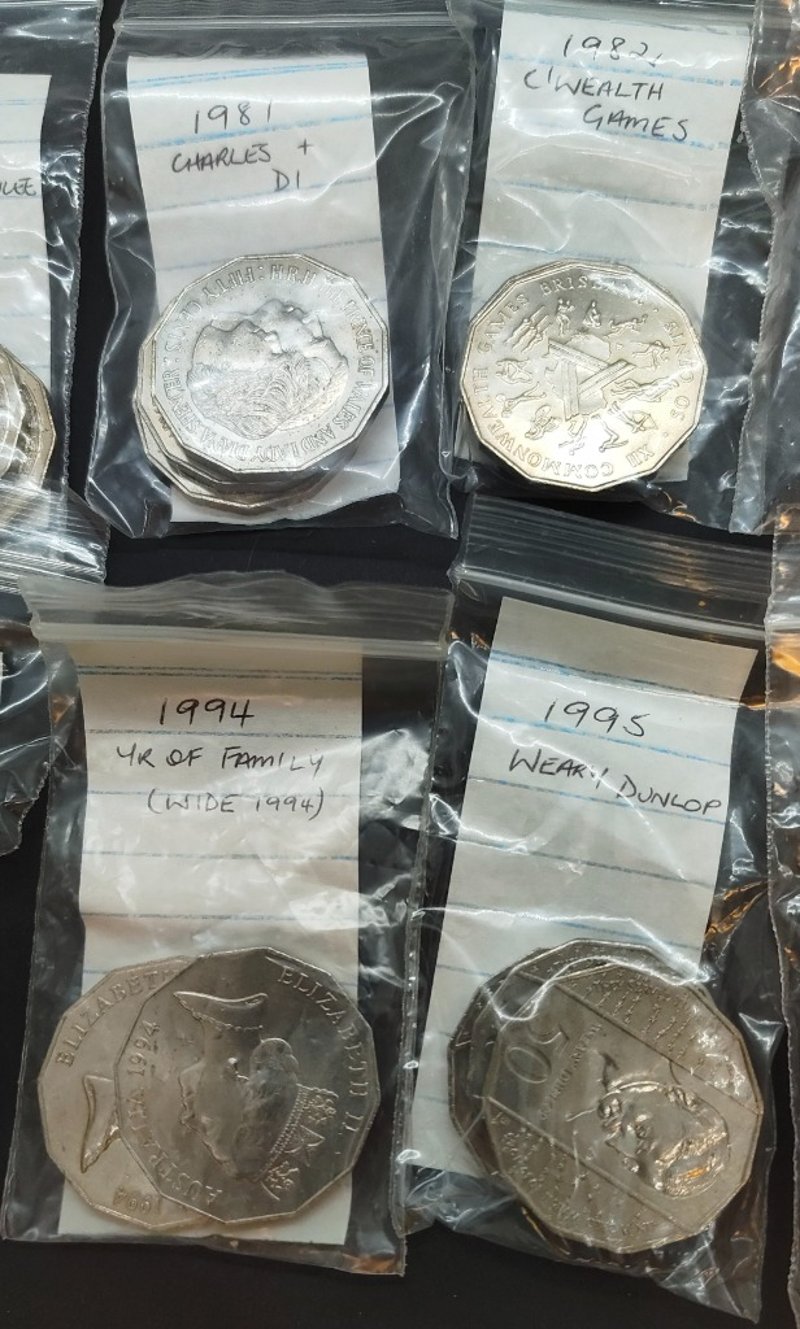 COLLECTION OF AUSTRALIAN 50C COINS 1966 - 1999Includes:1966 Round 50C1970 Captain James Cook1977 Silver Jubliee1981 Charles + Diana1982 Commonwealth Games1988 Bi-Centenary1991 25Th Anniversary Of Decimal Ram Head1993 Mintage Of 1 Million1994 Year Of Family (Reg Date)1995 Weary Dunlop1998 Bass + Flinders1999 StandardCondition: VfACACIA RIDGE585067+13