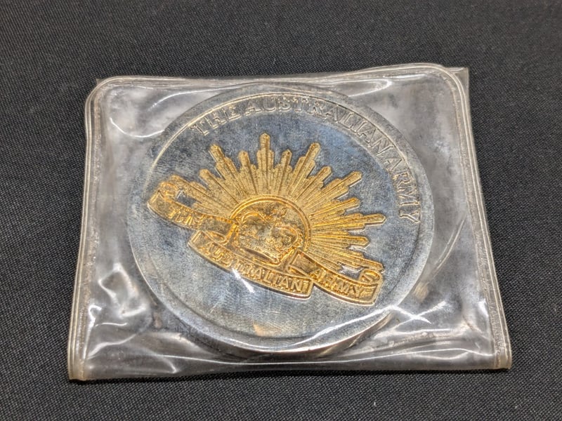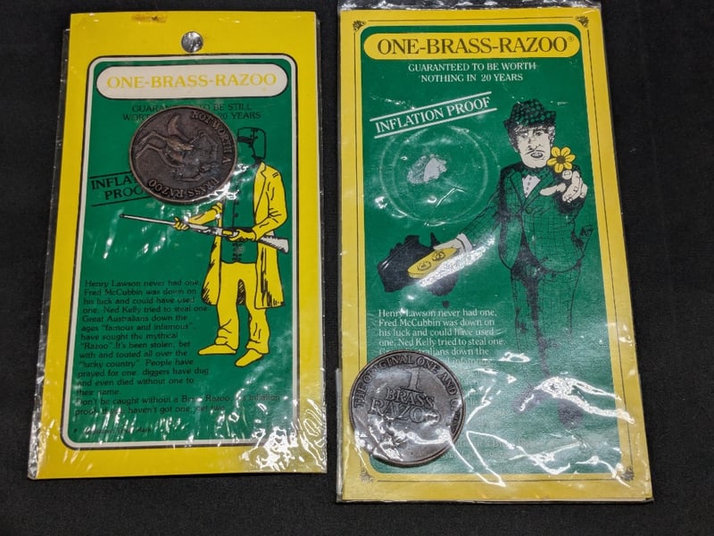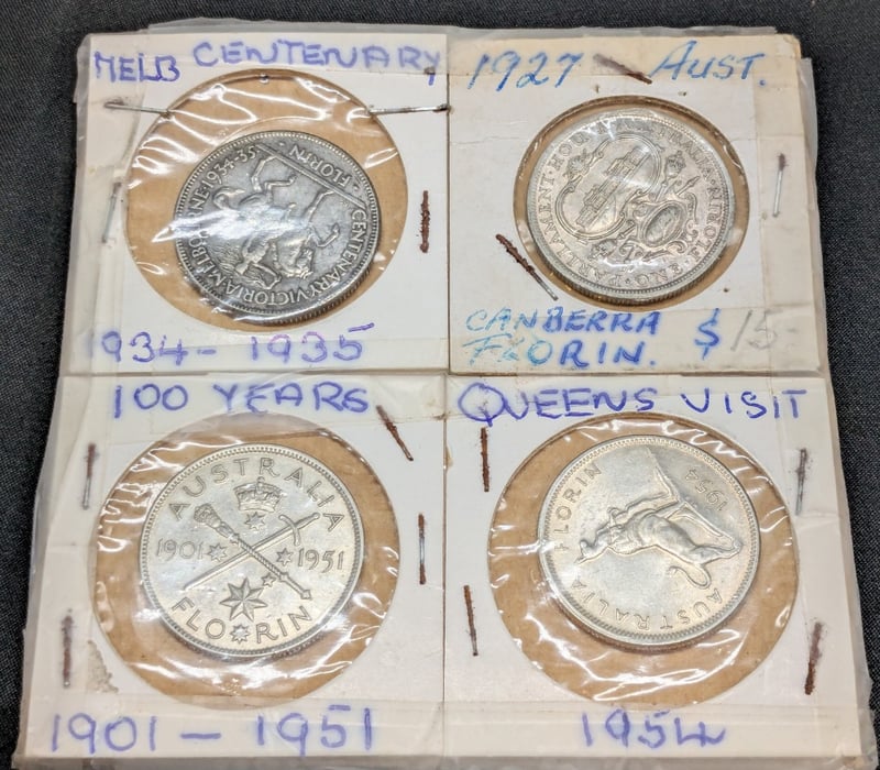 COLLECTION OF AUSTRALIAN COINSIncludes Two Brass Razoo Coins, Royal Australian Engineers Pewter Badge, Four Australian Florin Silver Coins, Etc585067+23