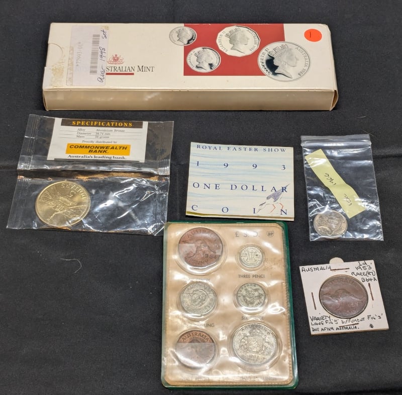 COLLECTION OF AUSTRALIAN COINSIncludes 1993 Royal Easter Show One Dollar, 1966 Australian Ten Cent, 1953 Australian Penny With Error, Etc585067+28