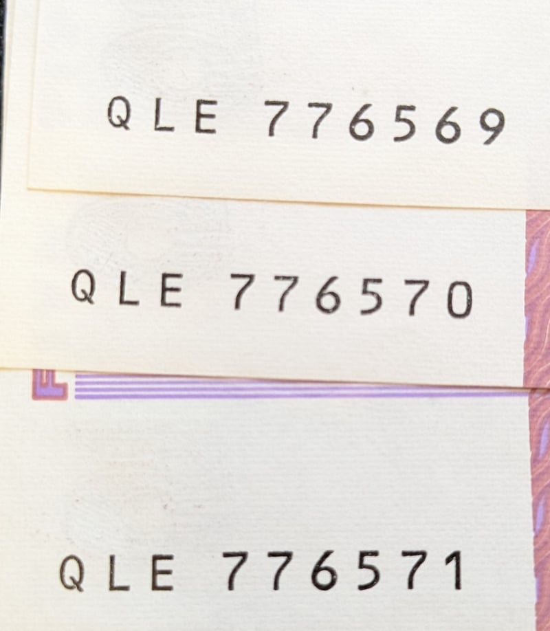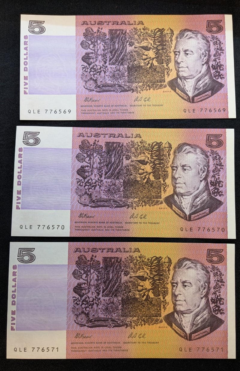 THREE CONSECUTIVE AUSTRALIAN FIVE DOLLAR BANK NOTES, SIGNED FRASER/ COLEPrefix: Qle 776569, Qle 776570, Qle 776571Condition: Aunc585096+5