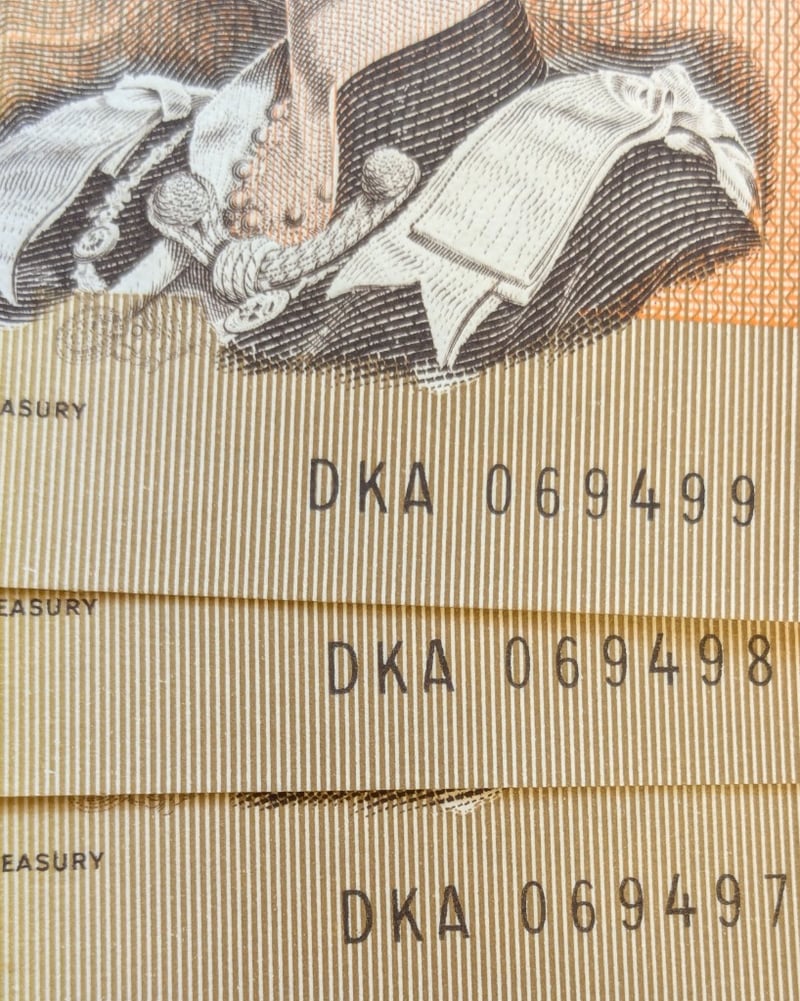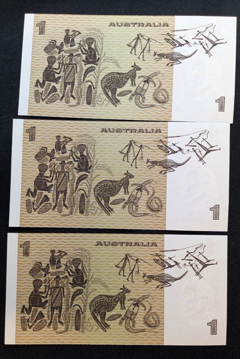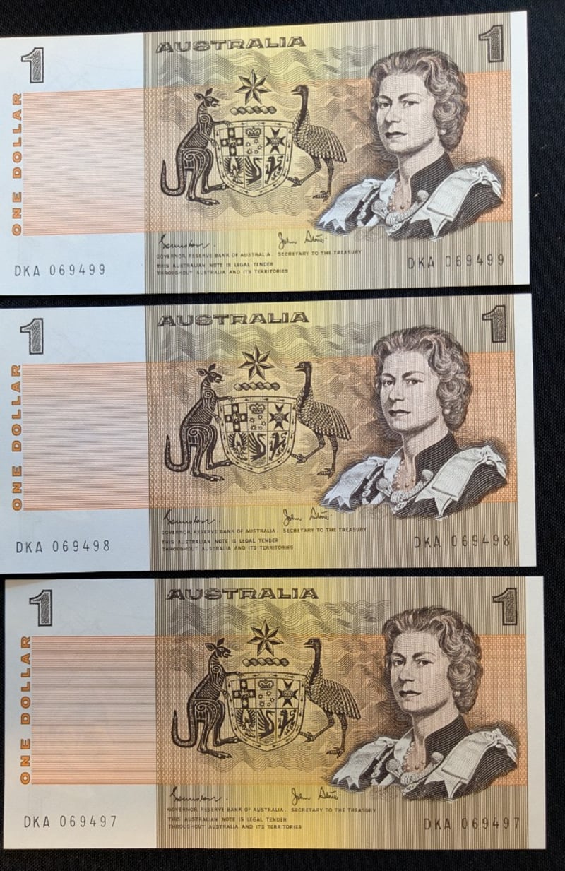 THREE CONSECUTIVE AUSTRALIAN ONE DOLLAR BANK NOTES, SIGNED JOHNSTON/ STONEPrefix: Dka 069497, Dka 069498, Dka 069499Condition: Aunc585096+7