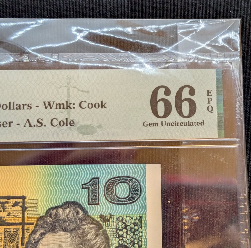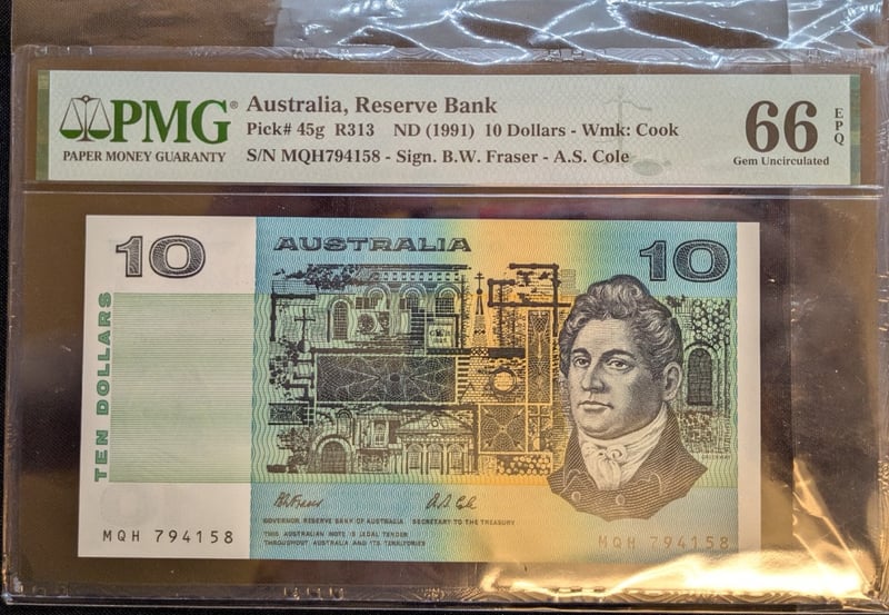 PMG GRADED AUSTRALIAN TEN DOLLAR BANK NOTE, SIGNED FRASER/ COLE