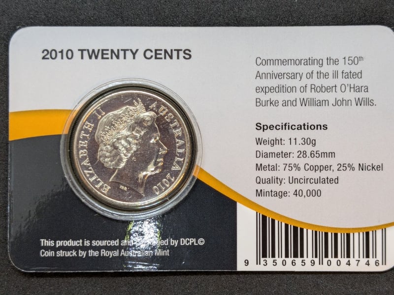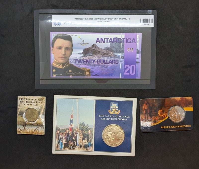 Includes 2006 Downies Antarctica Twenty Dollar Bank Note Worsley Polymer, 2010 Commemorative Twenty Cent Burke And Wills Expedition Coin, 1982 The Falkland Islands Liberation Crown Fifty Pence, 1995 Royal Australian Mint Uncirculated One Dollar Coin 'C' Mint Mark