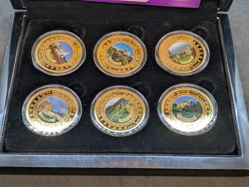 Prestigious Official Commemorative Collection Featuring Six Gilded Proof Coins, Each Depicting Iconic British Royal Residences. The Set Includes Windsor Castle, Palace Of Holyroodhouse, Buckingham Palace, Sandringham House, Balmoral Castle, And Kensington Palace.