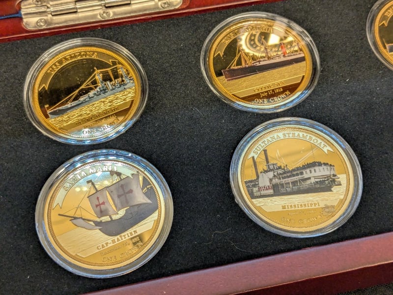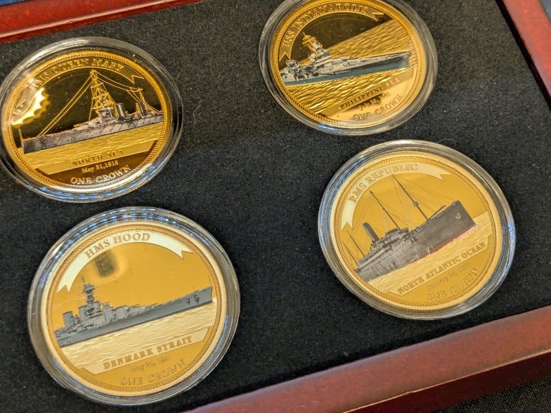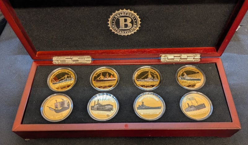 Prestigious Eight-Coin Collection Featuring Iconic Maritime Vessels Rendered In 24-Carat Gold. Each Proof Coin Presents Meticulous Artistry Depicting Famous Shipwrecks Including The Titanic, Rms Lusitania, Hms Hood, Sms Emden, Uss Quincy, Cunard Mauretania, And Additional Legendary Vessels.