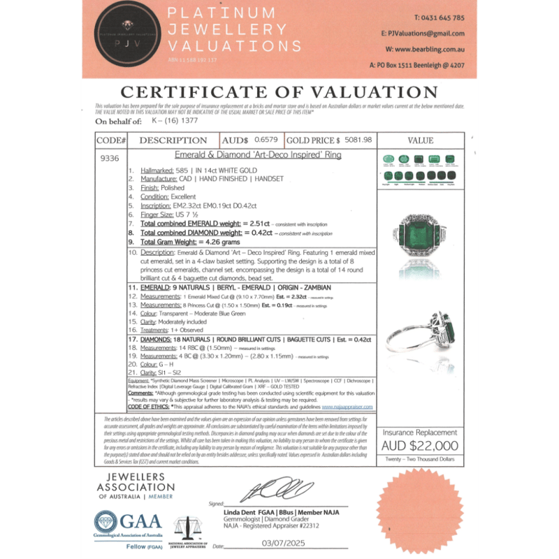 The Design Features, One Emerald Cut, Moderate Blue Green, Zambian Emerald (2.32Ct, Moderately Included), 4 Claw Set. Supporting The Design Are, 8 Princess Cut, Moderate Blue Green, Zambian Emeralds (0.19Ct Tsw, Moderately Included), Channel Set. Encompassing The Design Are, 14 Round Brilliant Cut, And 4 Baguette Cut, Diamonds (0.42Ct Tdw, G-H Colour, Si1-Si2 Clarity), Bead Set In White Gold. Ring Size O.