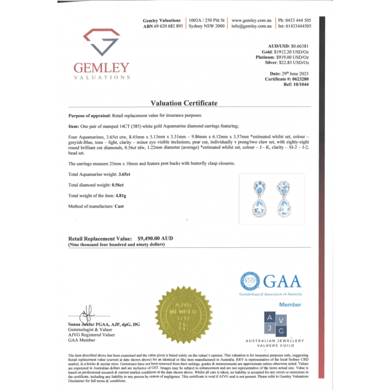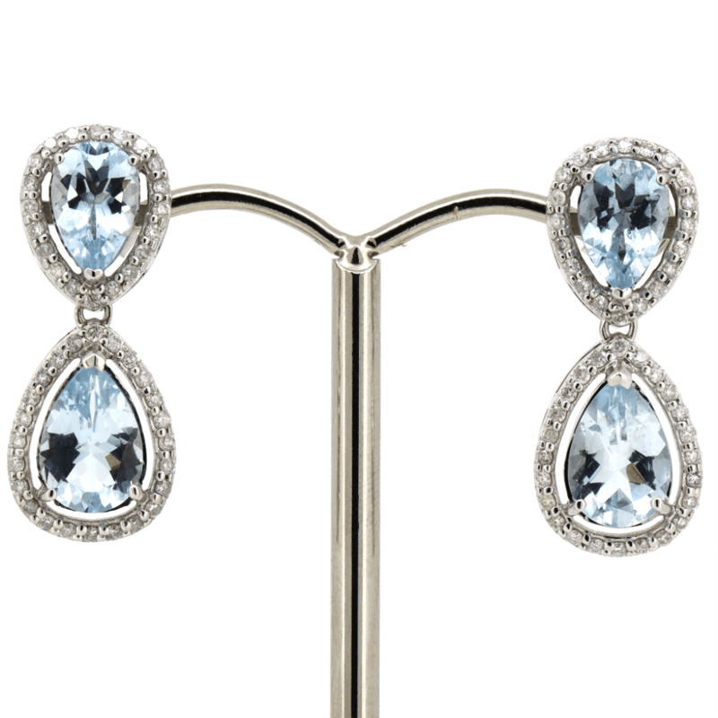 14K WHITE GOLD, AQUAMARINE AND DIAMOND, HALO DOUBLE DROP EARRINGS. The Design Features, 4 Pear Faceted Cut, Light Greyish-Blue, Aquamarines (3.65Ct Tsw, Minor Eye Visible Inclusions), Claw Set. Surrounded By, 88 Round Brilliant Cut, Diamonds (0.56Ct Tdw, J-K Colour, Si2-I2 Clarity), Bead Set. The Earrings Have Post Backs, With 14K White Gold Butterfly Clasps. Valuations Provided by an Independent Third-Party Professional Not Directly Associated With Lloyds Auctions at AUD $$9,490.00This valuation has been conducted by an independent third-party professional. The valuation amount is an assessment by the issuing valuer and does not reflect the auction value of the item. Any inquiries regarding the valuation should be directed to the issuing valuer (refer to contact details on the certificate), as Lloyds Auctions has no affiliation or influence over the valuation, the valuer, or the stated amount. Condition: Good - Refer Images 0645951+17