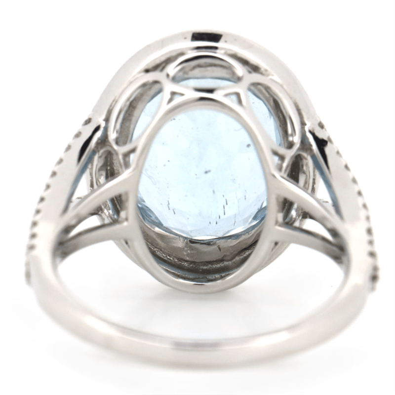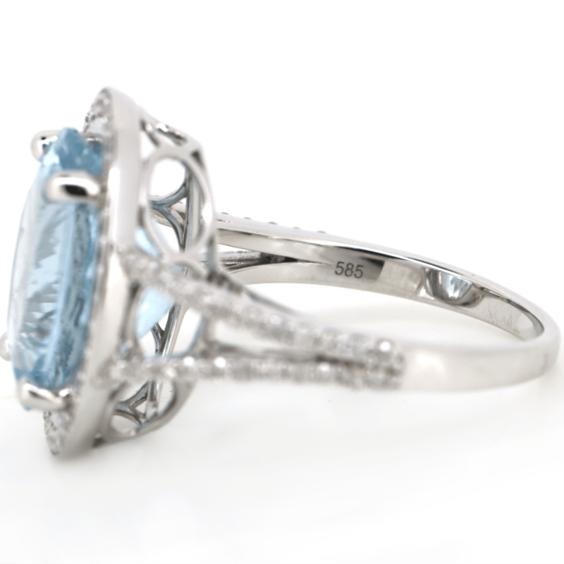 14K WHITE GOLD, AQUAMARINE AND DIAMOND, COCKTAIL RING. The Centre Features, One Oval Cut, Moderate Light Blue, Aquamarine (6.26Ct, Lightly Included), 4 Claw Set. Surrounding The Centre In A Halo And Decorating The Band Are, 80 Round Brilliant Cut, Diamonds (0.57Ct Tdw, G-H Colour, Si1-Si2 Clarity), Bead Set. Ring Size O. Valuations Provided by an Independent Third-Party Professional Not Directly Associated With Lloyds Auctions at AUD $$20,000.00This valuation has been conducted by an independent third-party professional. The valuation amount is an assessment by the issuing valuer and does not reflect the auction value of the item. Any inquiries regarding the valuation should be directed to the issuing valuer (refer to contact details on the certificate), as Lloyds Auctions has no affiliation or influence over the valuation, the valuer, or the stated amount. Condition: Good - Refer Images 0645951+19