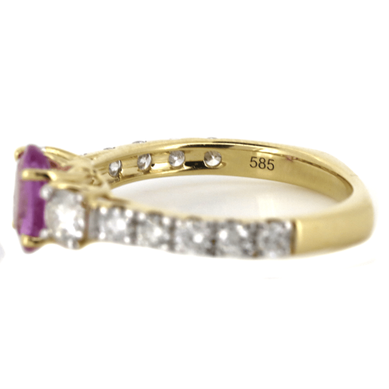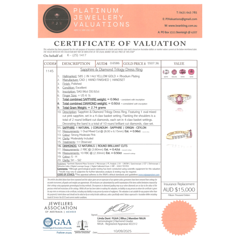 14K YELLOW GOLD, PINK SAPPHIRE AND DIAMOND, DRESS RING. The Centre Features One Oval Mixed Cut, Strong Moderate Pink, Sapphire (0.96Ct, Moderately Included- Clarity), Claw Set. Decorating The Shoulders Are 2 Round Brilliant Cut, Diamonds (0.42Ct Tdw, G-H Colour, Si1-Si2 Clarity). Embellishing The Band Are 10 Round Brilliant Cut, Diamonds (0.50Ct Tdw, G-H Colour, Si1-Si2 Clarity), Claw Set. Ring Size M 1/2. Valuations Provided by an Independent Third-Party Professional Not Directly Associated With Lloyds Auctions at AUD $$15,000.00This valuation has been conducted by an independent third-party professional. The valuation amount is an assessment by the issuing valuer and does not reflect the auction value of the item. Any inquiries regarding the valuation should be directed to the issuing valuer (refer to contact details on the certificate), as Lloyds Auctions has no affiliation or influence over the valuation, the valuer, or the stated amount. Condition: Good - Refer Images 0645951+22