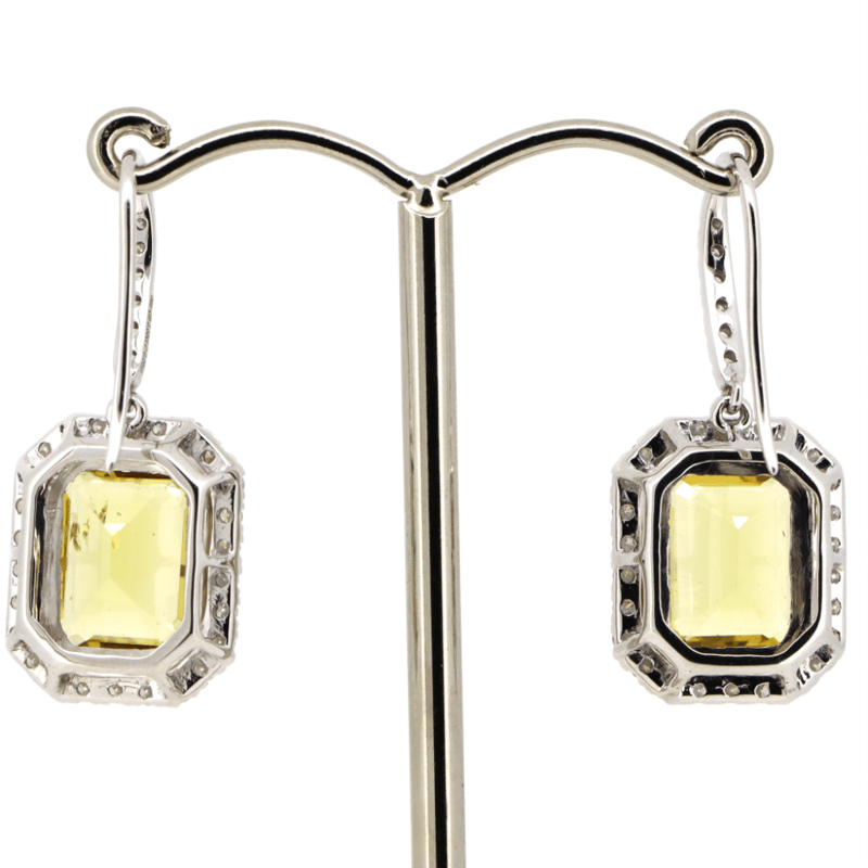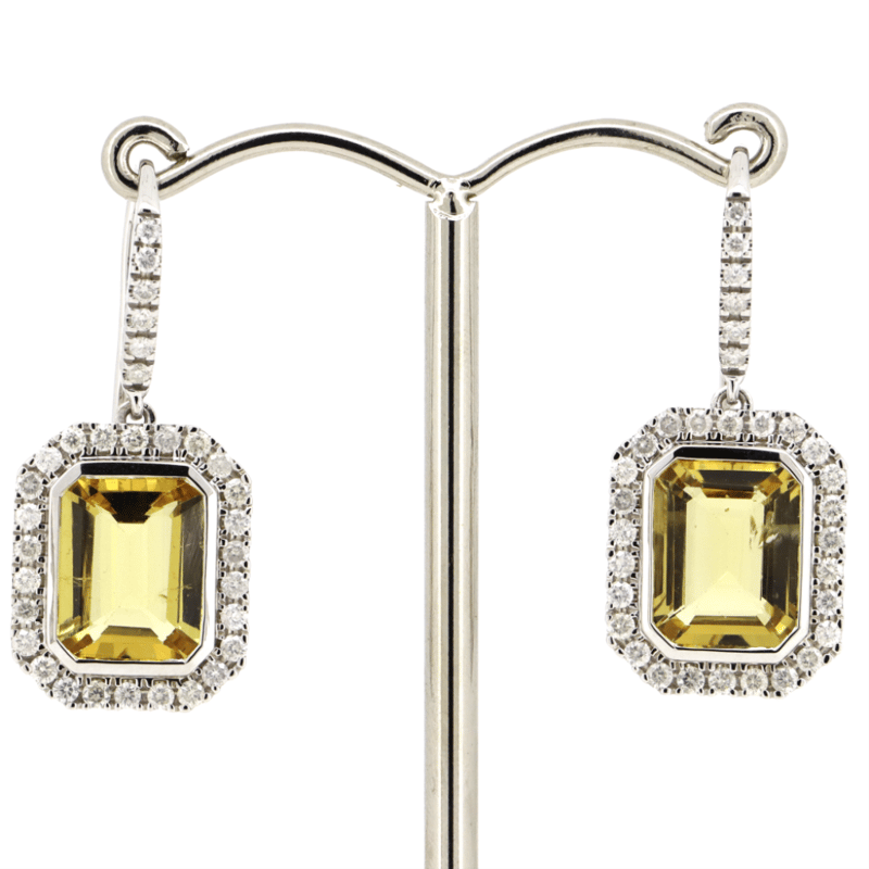 14K WHITE GOLD, HELIODOR AND DIAMOND, HALO DROP EARRINGS. The Drops Feature, 2 Emerald Cut, Medium Greyish-Yellow, Heliodors (5.85Ct Tsw, Minor Eye Visible Inclusions), Bezel Set. Surrounding The Centres In Halos And Decorating The Hooks Are, 64 Round Brilliant Cut, Diamonds (0.86Ct Tdw, J-K Colour, Si2-I2 Clarity), Micro-Bead Set. The Earrings Have Shepherd Hooks. Valuations Provided by an Independent Third-Party Professional Not Directly Associated With Lloyds Auctions at AUD $$11,490.00This valuation has been conducted by an independent third-party professional. The valuation amount is an assessment by the issuing valuer and does not reflect the auction value of the item. Any inquiries regarding the valuation should be directed to the issuing valuer (refer to contact details on the certificate), as Lloyds Auctions has no affiliation or influence over the valuation, the valuer, or the stated amount. Condition: Good - Refer Images 0645951+24