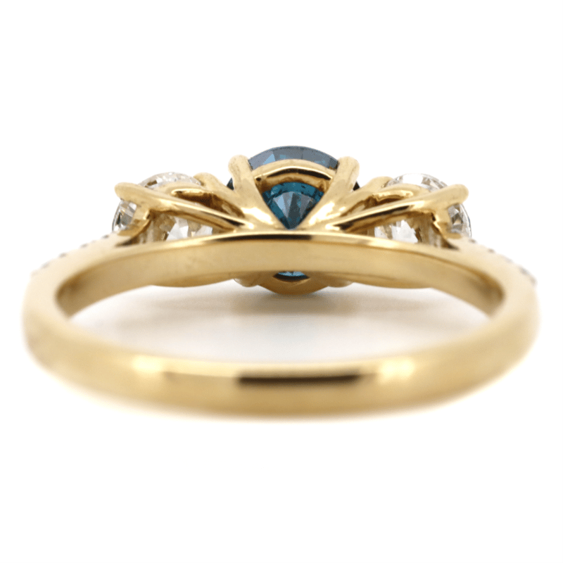 14K YELLOW GOLD, BLUE DIAMOND AND DIAMOND, TRILOGY RING.