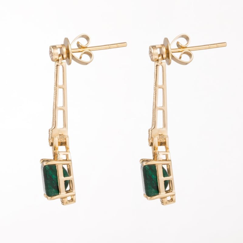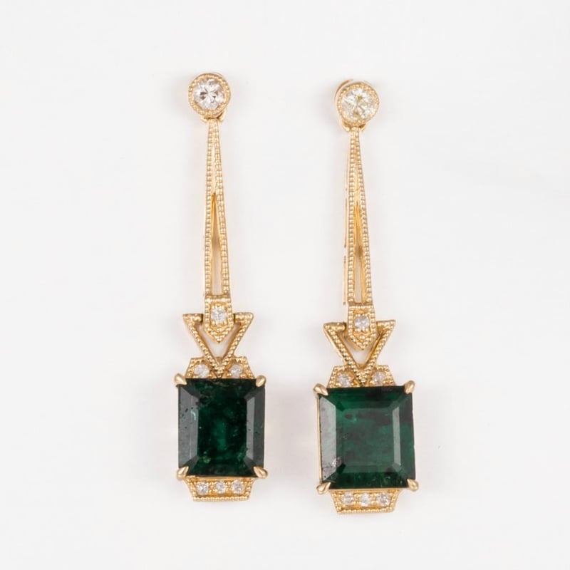 14CT YELLOW GOLD ZAMBIAN EMERALD AND DIAMOND ART DECO STYLE EARRINGS Featuring, 2 Rectangular Step Cut, Very Dark Green Zambian Emeralds (2.72Ct, Heavy Inclusions), Claw Set, With 14 Round Brilliant Cut Diamonds (0.13Ct Tdw, G-H Colour, Vs2-Si1 Clarity), Bezel/Bead Set. Valuations Provided by an Independent Third-Party Professional Not Directly Associated With Lloyds Auctions at AUD $16900This valuation has been conducted by an independent third-party professional. The valuation amount is an assessment by the issuing valuer and does not reflect the auction value of the item. Any inquiries regarding the valuation should be directed to the issuing valuer (refer to contact details on the certificate), as Lloyds Auctions has no affiliation or influence over the valuation, the valuer, or the stated amount. Condition: Good - Refer Images 0582881+1980