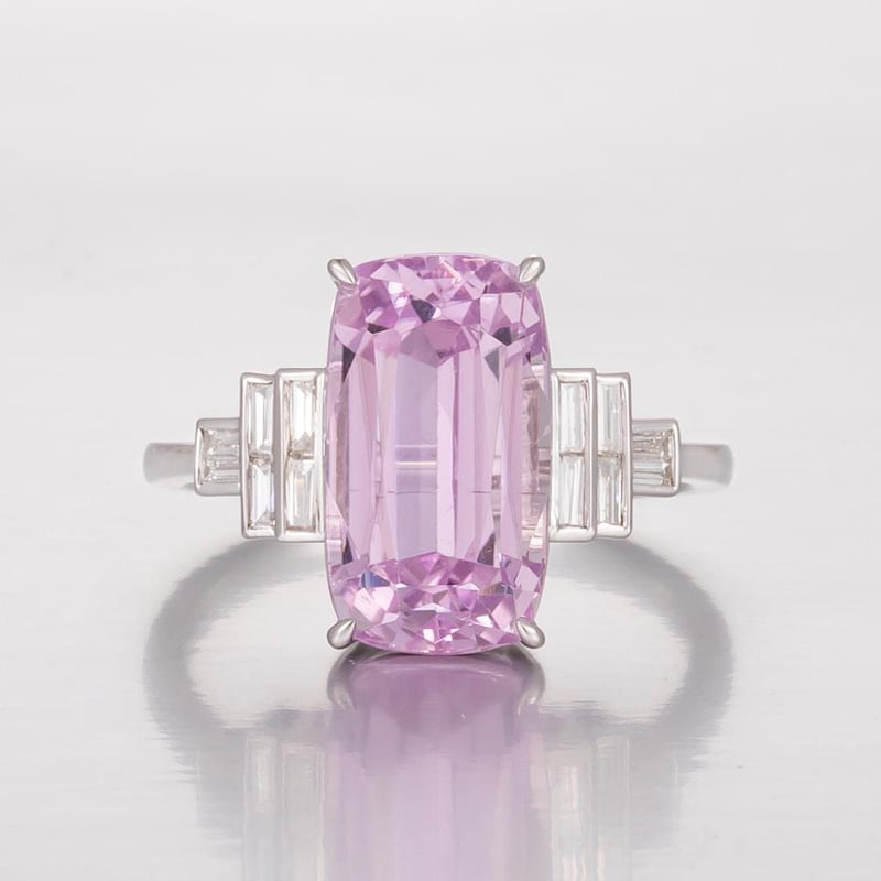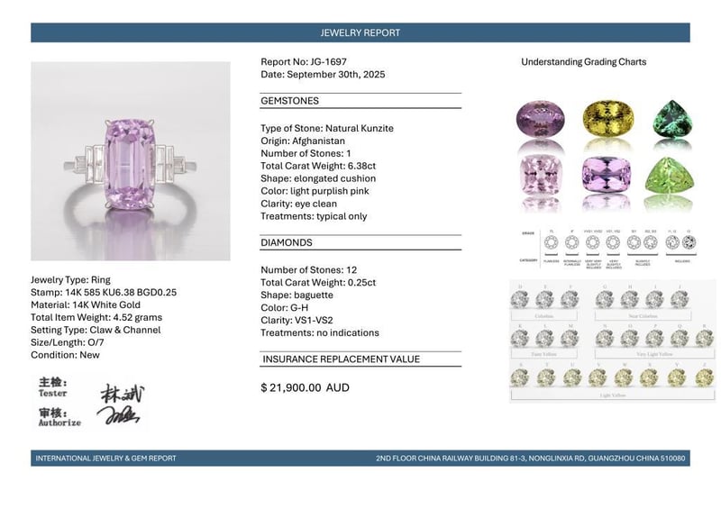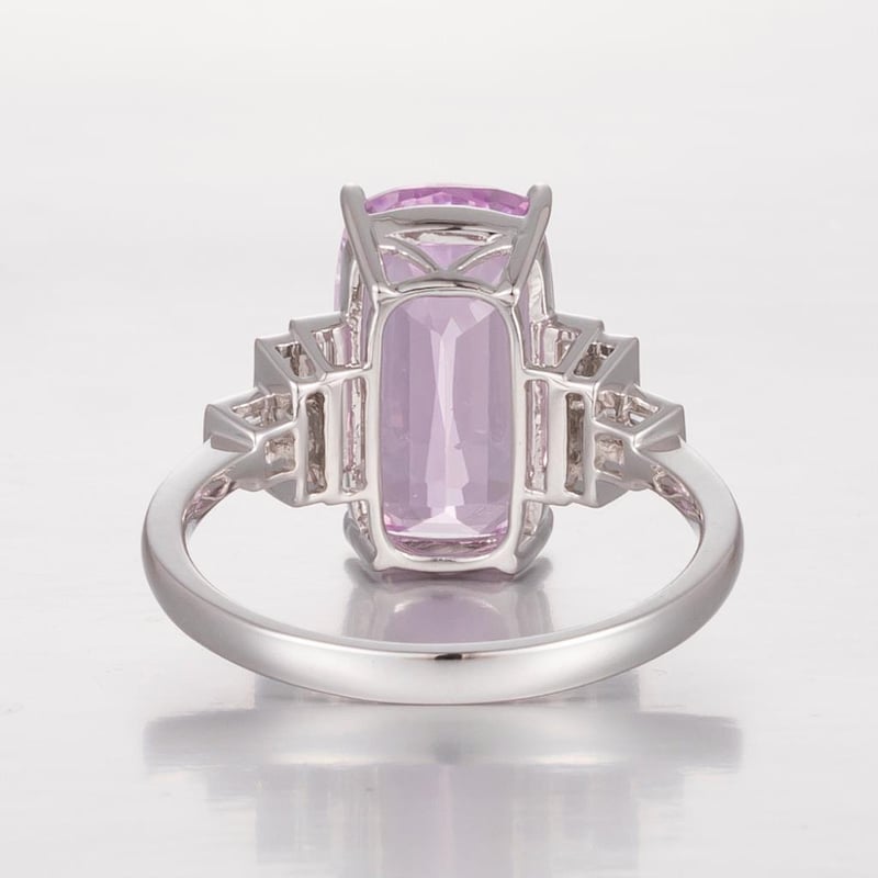 14CT WHITE GOLD AFGHAN KUNZITE AND DIAMOND ANTIQUE STYLE RING Featuring Centre, One Elongated Cushion Cut, Light Purplish-Pink Afghan Kunzite (6.38Ct, Eye Clean), Claw Set, With 12 Baguette Cut Diamonds (0.25Ct Tdw, G-H Colour, Vs1-Vs2 Clarity), Channel Set. Ring Size O. Valuations Provided by an Independent Third-Party Professional Not Directly Associated With Lloyds Auctions at AUD $21900This valuation has been conducted by an independent third-party professional. The valuation amount is an assessment by the issuing valuer and does not reflect the auction value of the item. Any inquiries regarding the valuation should be directed to the issuing valuer (refer to contact details on the certificate), as Lloyds Auctions has no affiliation or influence over the valuation, the valuer, or the stated amount. Condition: Good - Refer Images 0582881+1981