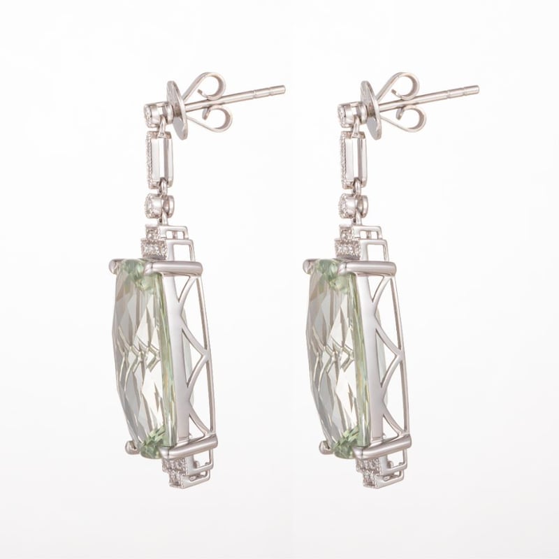9CT WHITE GOLD GREEN AMETHYST AND DIAMOND DROP EARRINGS
