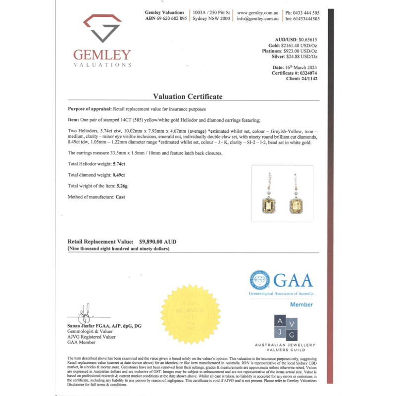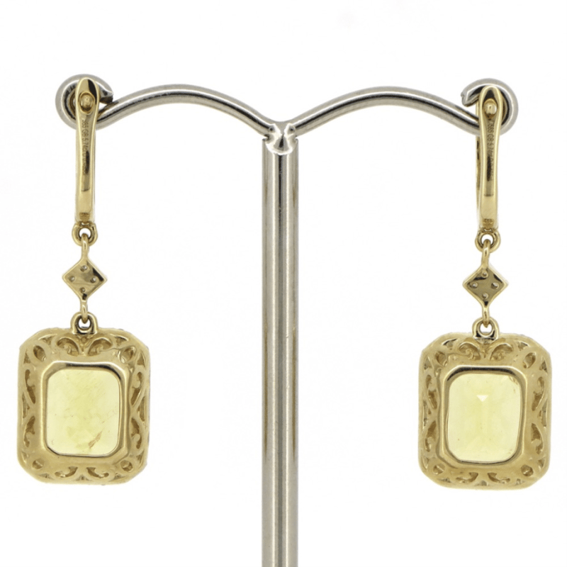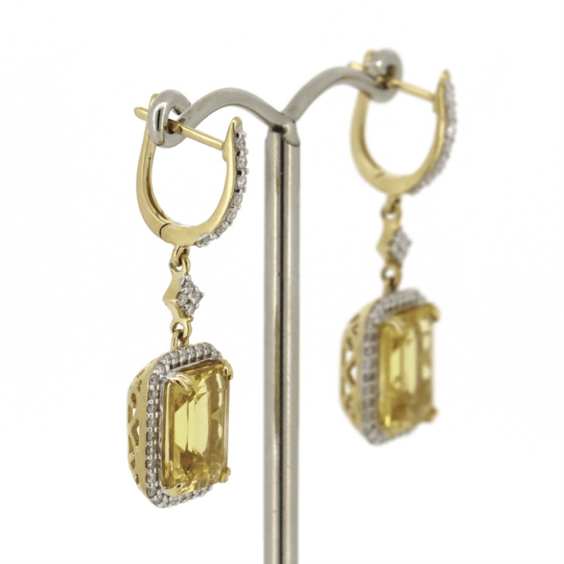 The Drops Feature Centres , 2 Emerald Cut, Heliodors (5.74Ct Tsw, Minor Eye Visible Inclsuions), Bezel Set. Surrounding The Centres In Halos And Decorating The Hooks Are, 90 Round Brilliant Cut, Diamonds (0.49Ct Tdw, J-K Colour, Si2-I2 Clarity), Micro-Bead Set. The Earrings Have Latch Back Closures.