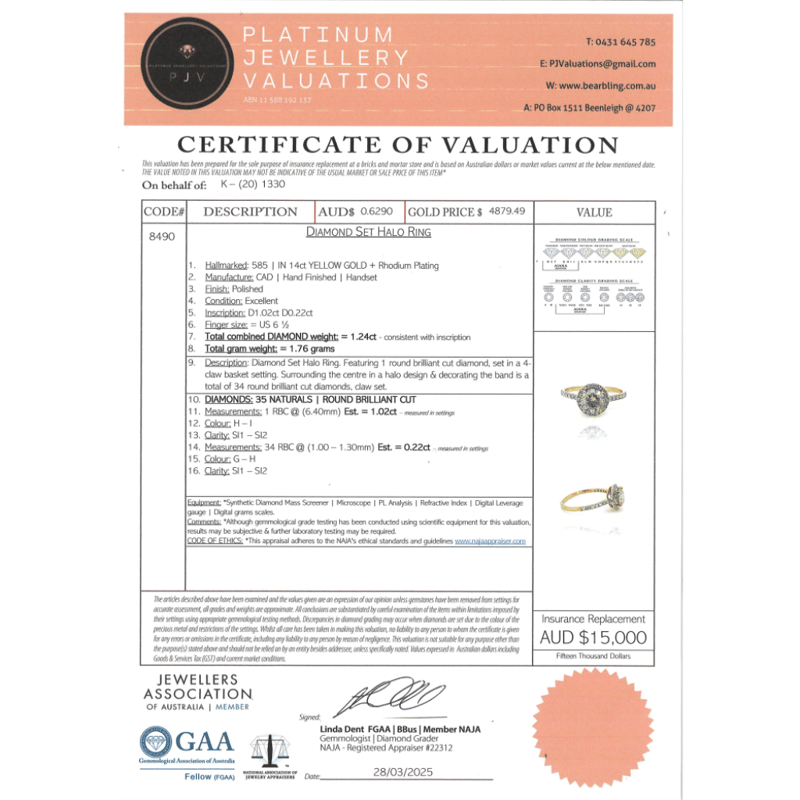 The Centre Features, One Round Brilliant Cut, Diamond (1.02Ct, H-I Colour, Si1-Si2 Clarity), 4 Claw Set. Surrounding The Centre In A Halo And Decorating The Band Are, 34 Round Brilliant Cut, Diamonds (0.22Ct Tdw, G-H Colour, Si1-Si2 Clarity), Claw Set. Ring Size M ½.