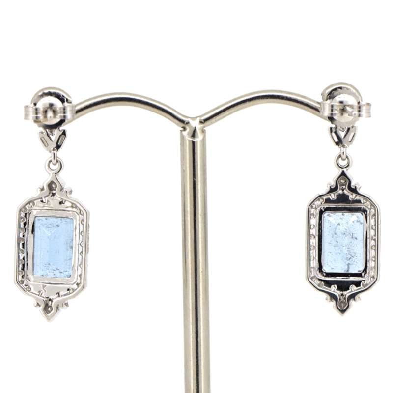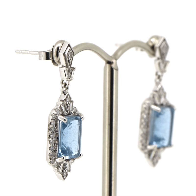 The Centre Features, 2 Emerald Cut, Medium Greyish-Blue, Aquamarines (2.73Ct Tsw, Minor Eye Inclusions), 4 Claw Set. Decorating The Centres Are, 12 Baguette And 46 Round Brilliant Cut, Diamonds (0.37Ct Tdw, J-K Colour, Si2-I2 Clarity), Micro-Claw/Bead Set. The Earrings Have Post Backs With 14K White Gold Butterfly Clasps.