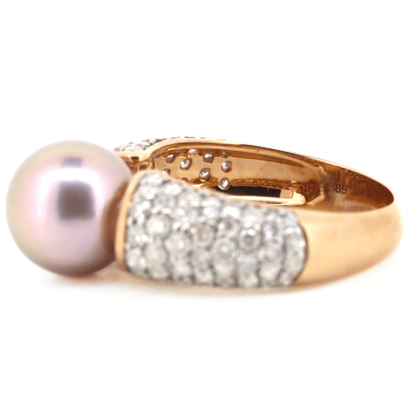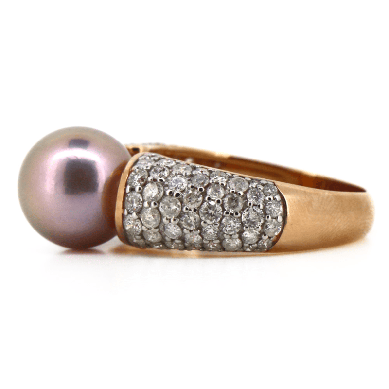 14K ROSE GOLD, PURPLE CULTURED SOUTH SEA PEARL AND DIAMOND, STATEMENT RING.