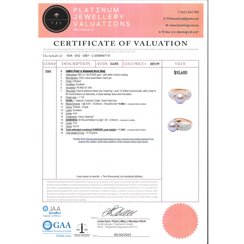 The Centre Features, One Round, Pinkish-Purple, Cultured South Sea Pearl (9.50Mm - 10.00Mm Size). Accompanied By, 84 Round Brilliant Cut, Diamonds (1.34Ct Tdw, H-K Colour, P2-P3 Clarity), Bead Set. Ring Size O.