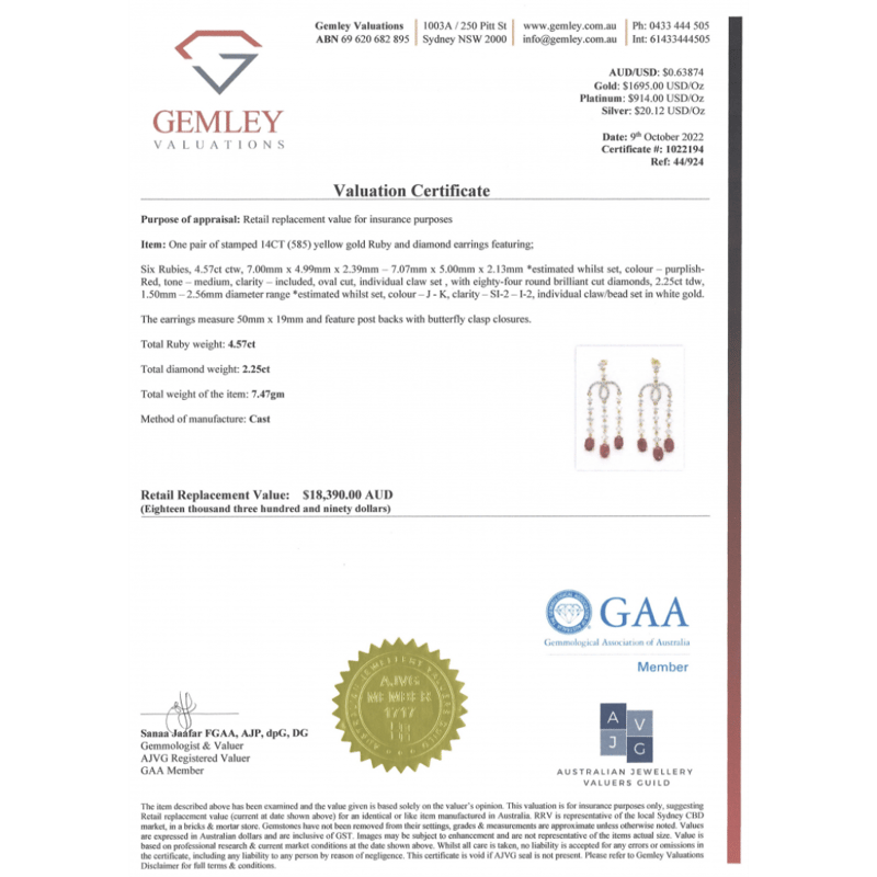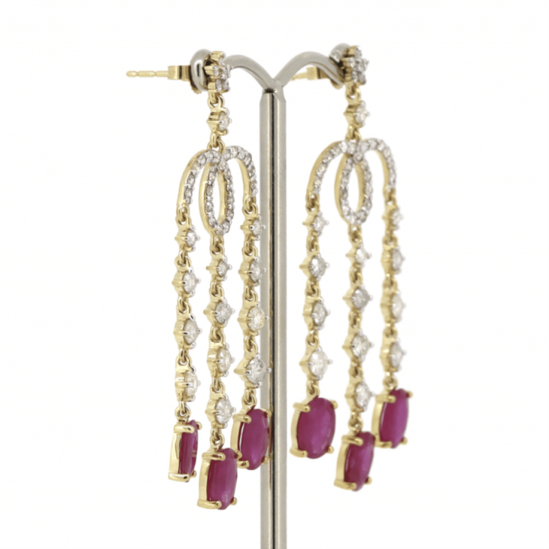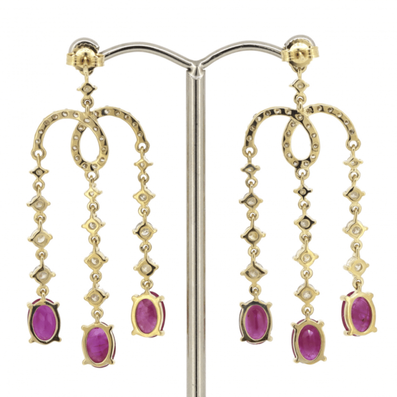 The Design Features, 6 Oval Cut, Medium Purplish-Red, Rubies (4.57Ct Tsw, Included), Claw Set. Decorating The Design Are, 84 Round Brilliant Cut, Diamonds (2.25Ct Tdw, J-K Colour, Si2-I2 Clarity), Claw/Bead Set In White Gold. The Earrings Have Post Backs, With 14K Yellow Gold Butterfly Clasps.