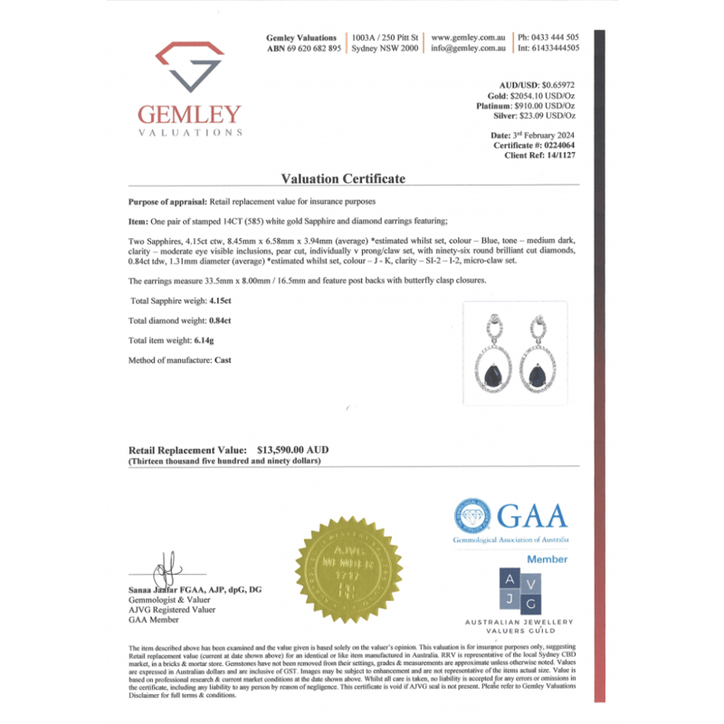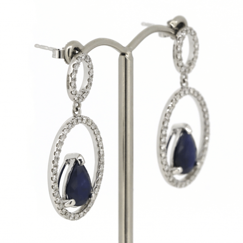 The Design Features, 2 Pear Cut, Medium Dark Royal Blue, Sapphires (4.15Ct Tsw, Eye Visible Inclusions), 3 Claw Set. Decorating The Centres In Double Oval Hoops Are, 96 Round Brilliant Cut, Diamonds (0.84Ct Tdw, J-K Colour, Si2-I2 Clarity), Claw Set. The Earrings Have Post Backs, With 14K White Gold Butterfly Clasps.