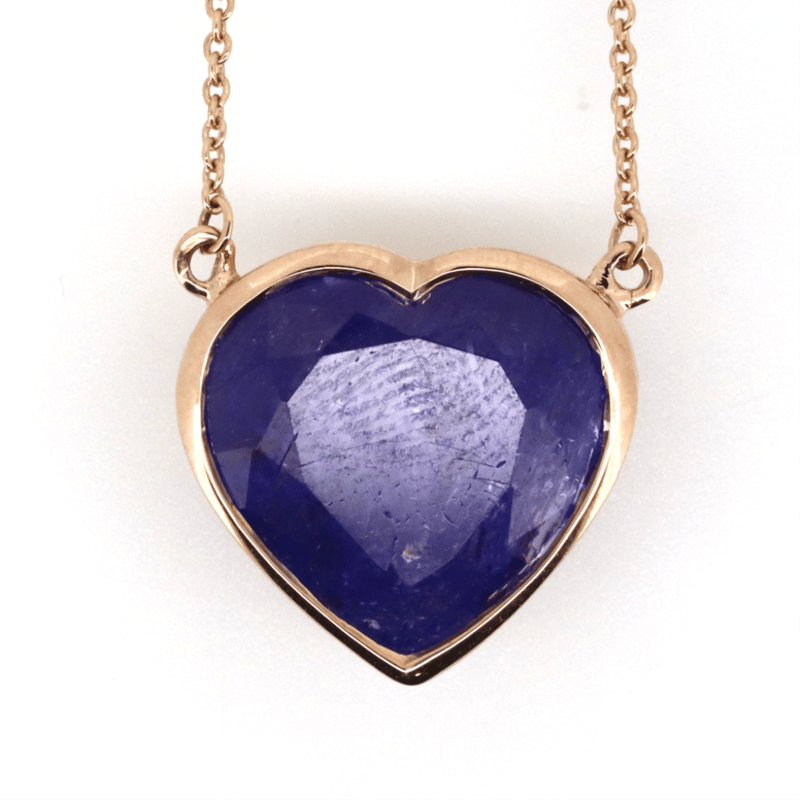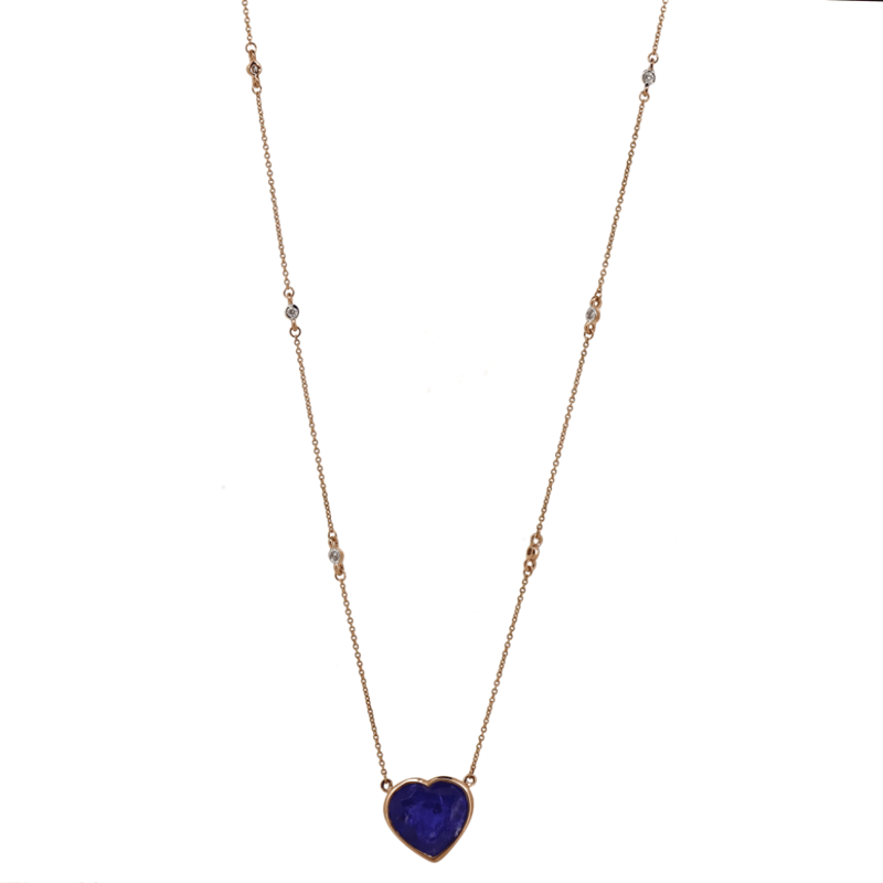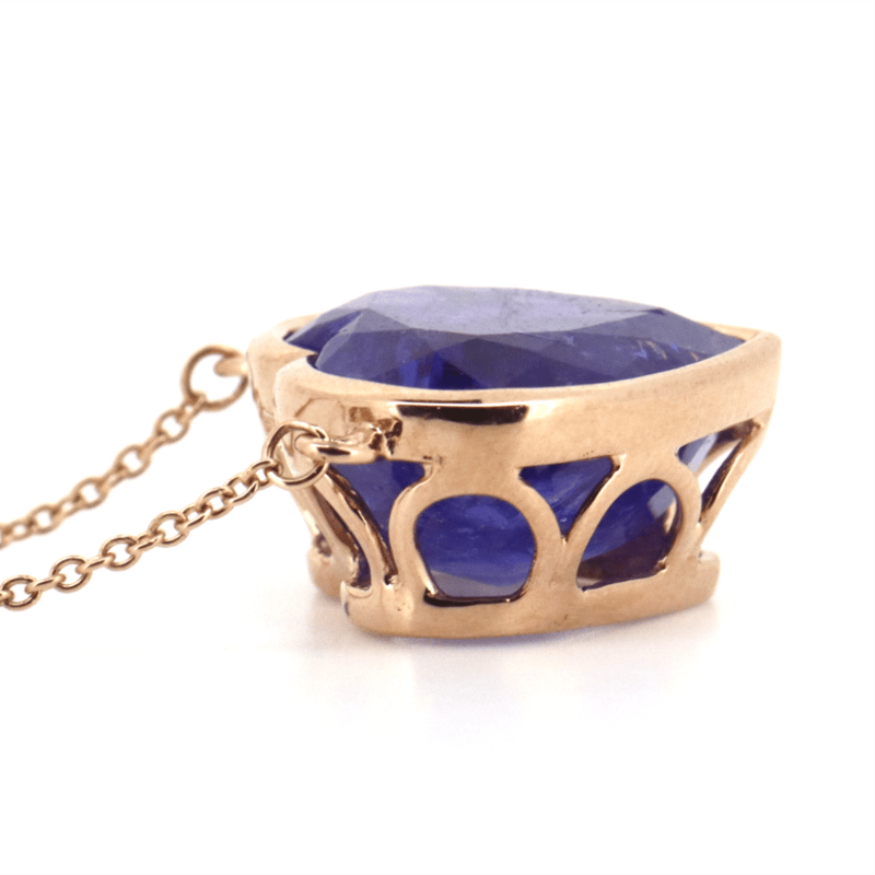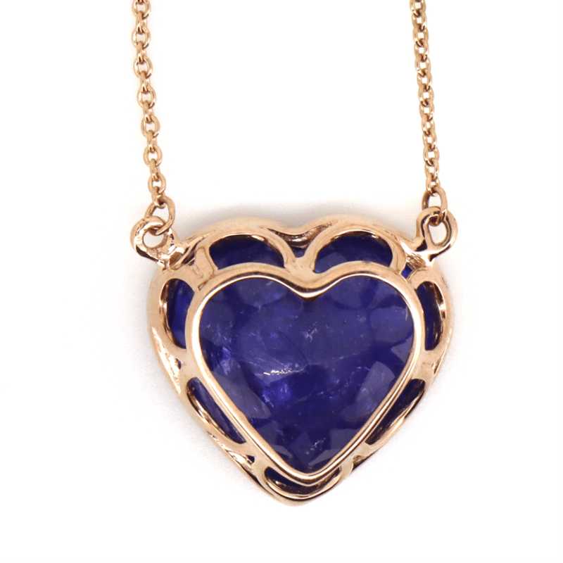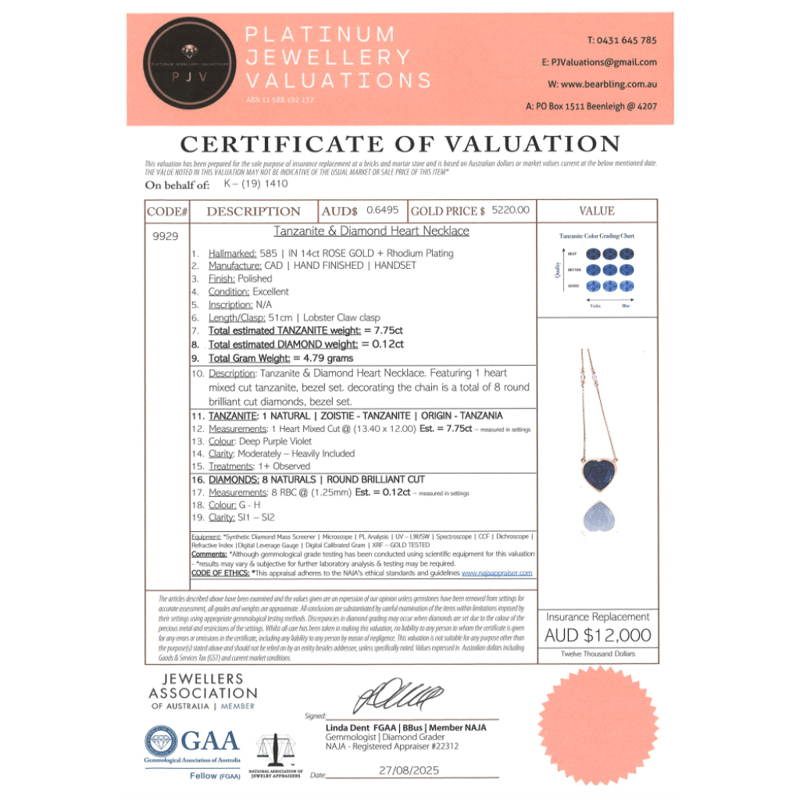 14K ROSE GOLD, TANZANITE AND DIAMOND, NECKLACE. The Necklace Features, One Heart Cut, Deep Purple Violet, Tanzanite (7.75Ct, Moderately-Heavily Included), Bezel Set. Decorating The Chain Are, 8 Round Brilliant Cut, Diamonds (0.12Ct Tdw, G-H Colour, Si1-Si2 Clarity), Bezel Set. The Necklace Has A Lobster Claw Clasp. Chain Length Is 51Cm. Valuations Provided by an Independent Third-Party Professional Not Directly Associated With Lloyds Auctions at AUD $$12,000.00This valuation has been conducted by an independent third-party professional. The valuation amount is an assessment by the issuing valuer and does not reflect the auction value of the item. Any inquiries regarding the valuation should be directed to the issuing valuer (refer to contact details on the certificate), as Lloyds Auctions has no affiliation or influence over the valuation, the valuer, or the stated amount. Condition: Good - Refer Images 0645955+147