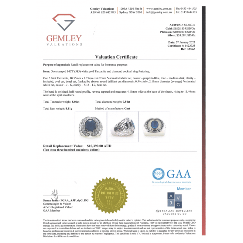 The Centre Features, One Oval Cut, Purplish-Blue, Tanzanite (5.06Ct, Included), Bezel Set. Surrounding The Centre In A Halo Are, 16 Round Brilliant Cut, Diamonds (0.54Ct Tdw, J-K Colour, Si2-I2 Clarity), Claw Set. Ring Size R.