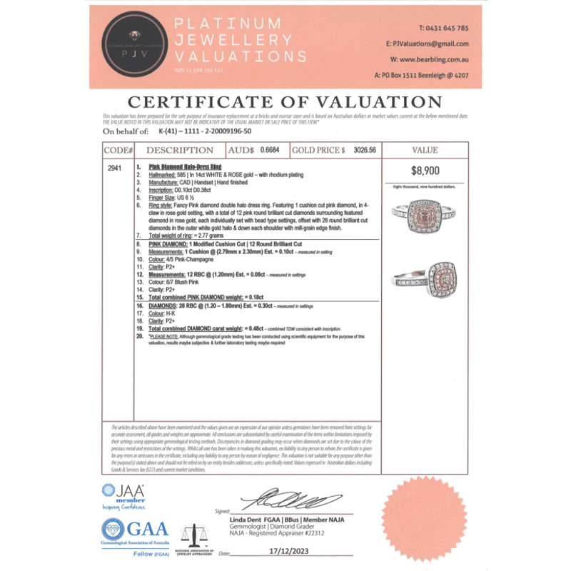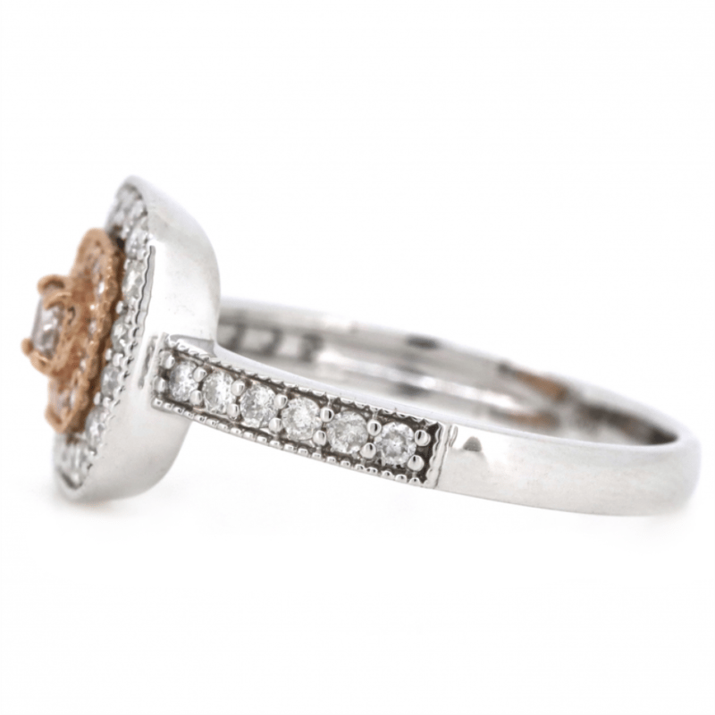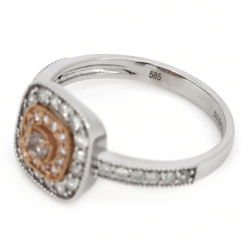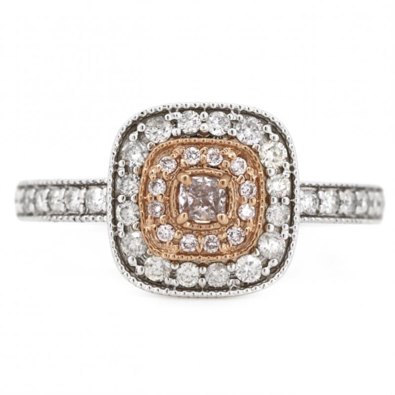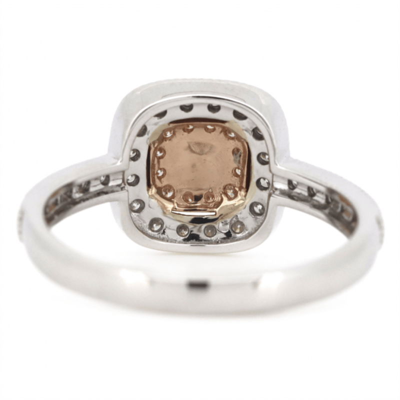 The Centre Features, One Modified Cushion Cut, Fancy Pink Champagne, Diamond (0.10Ct, P2+ Clarity), 4 Claw Set In Rose Gold. Surrounding The Centre In The Inner Halo Are, 12 Round Brilliant Cut, Blush Pink, Diamonds (0.08Ct Tdw, P2+ Clarity), Bead Set In Rose Gold. Encompassing The Centre Are, 28 Round Brilliant Cut, Diamonds (0.30Ct Tdw, H-K Colour, P2+ Clarity), Bead Set With Millegrain Edging In White Gold. Ring Size M.