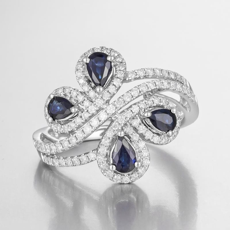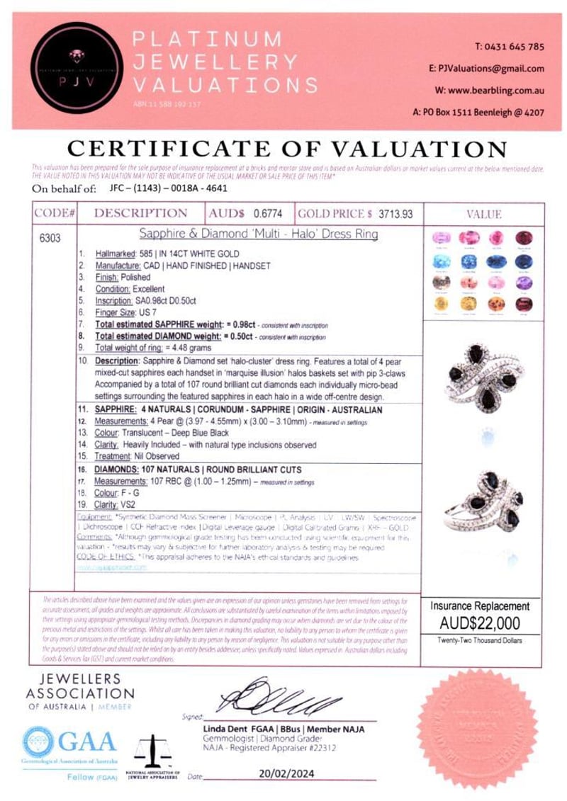 Featuring Centre, 4 Pear Cut, Deep Blue Black Australian Sapphires (0.98Ct Tsw, Heavily Included), Claw Set, With 107 Round Brilliant Cut Diamonds (0.50Ct Tdw, F-G Colour, Vs2 Clarity), Bead Set. Ring Size O.