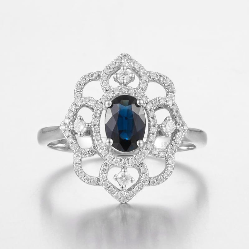 Featuring Centre, One Oval Cut, Deep Moderate Blue Sapphire (0.63Ct, Slightly Included), Claw Set, With 98 Round Brilliant Cut Diamonds (0.25Ct Tdw, G-H Colour, Vs1-Vs2 Clarity), Bead Set. Ring Size O.