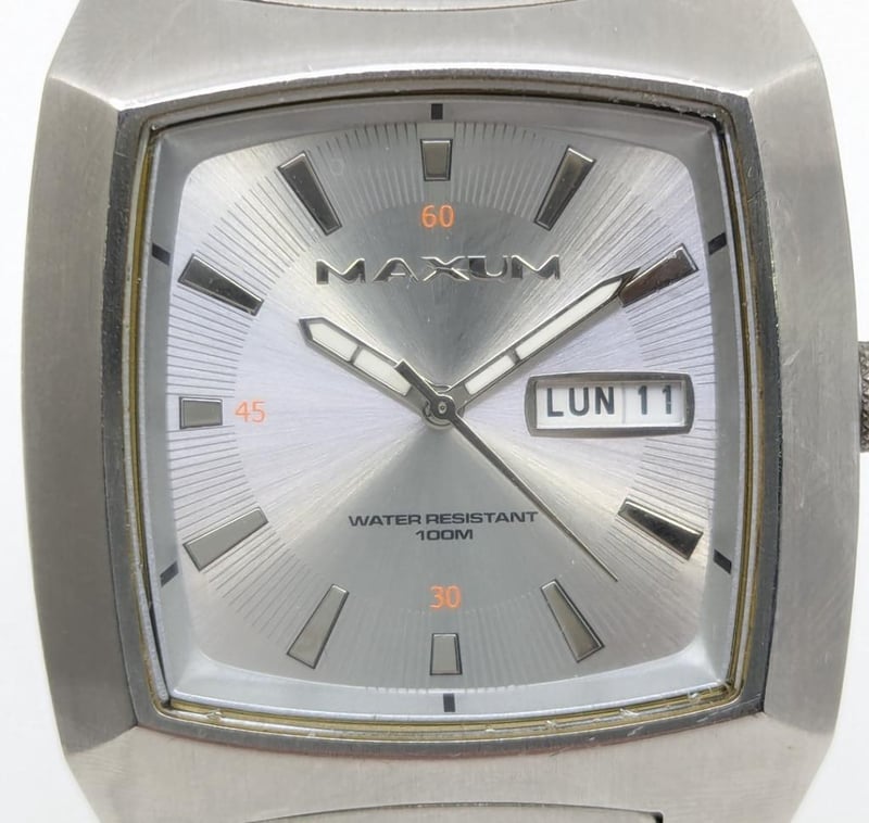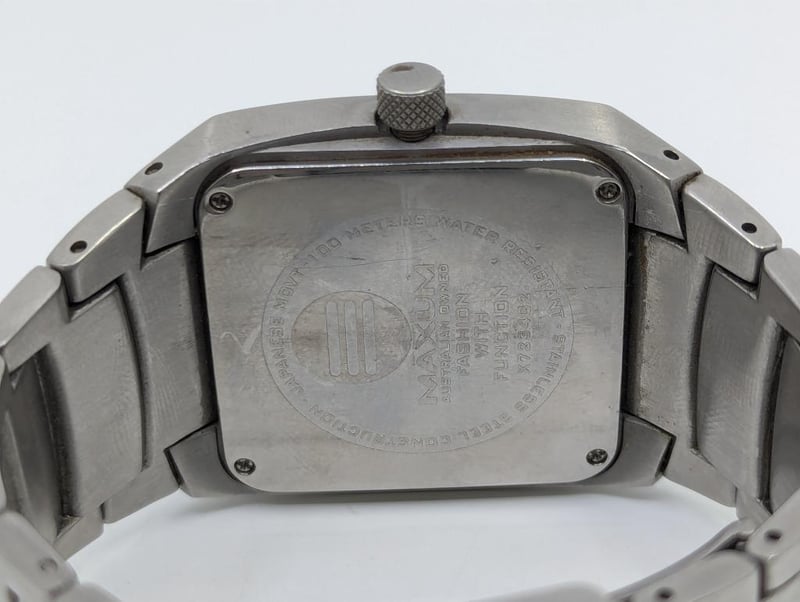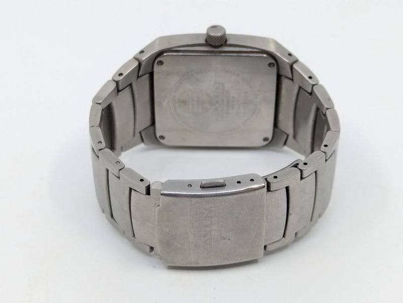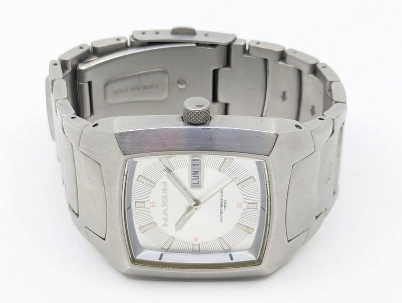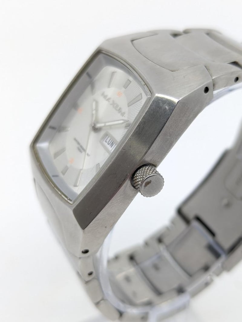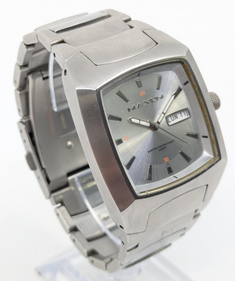 MAXIM X7234G2 REFERENCE NO. X7234G2CASE DESCRIPTION: STAINLESS STEELCASE SIZE: 39MMBRACELET: STAINLESS STEELMOVEMENT: JAPANESE MOVEMENTBOX: NOT INCLUDEDPAPERS: NOT INCLUDEDCondition: Good - Refer To ImagesAdditional Information: Silver DialNon Numerical Hour MarkersLuminous HandsDate Display At 3 O'Clock PositionFold ClaspWater Resistant: 100MMovement UntestedVAULT582865+2